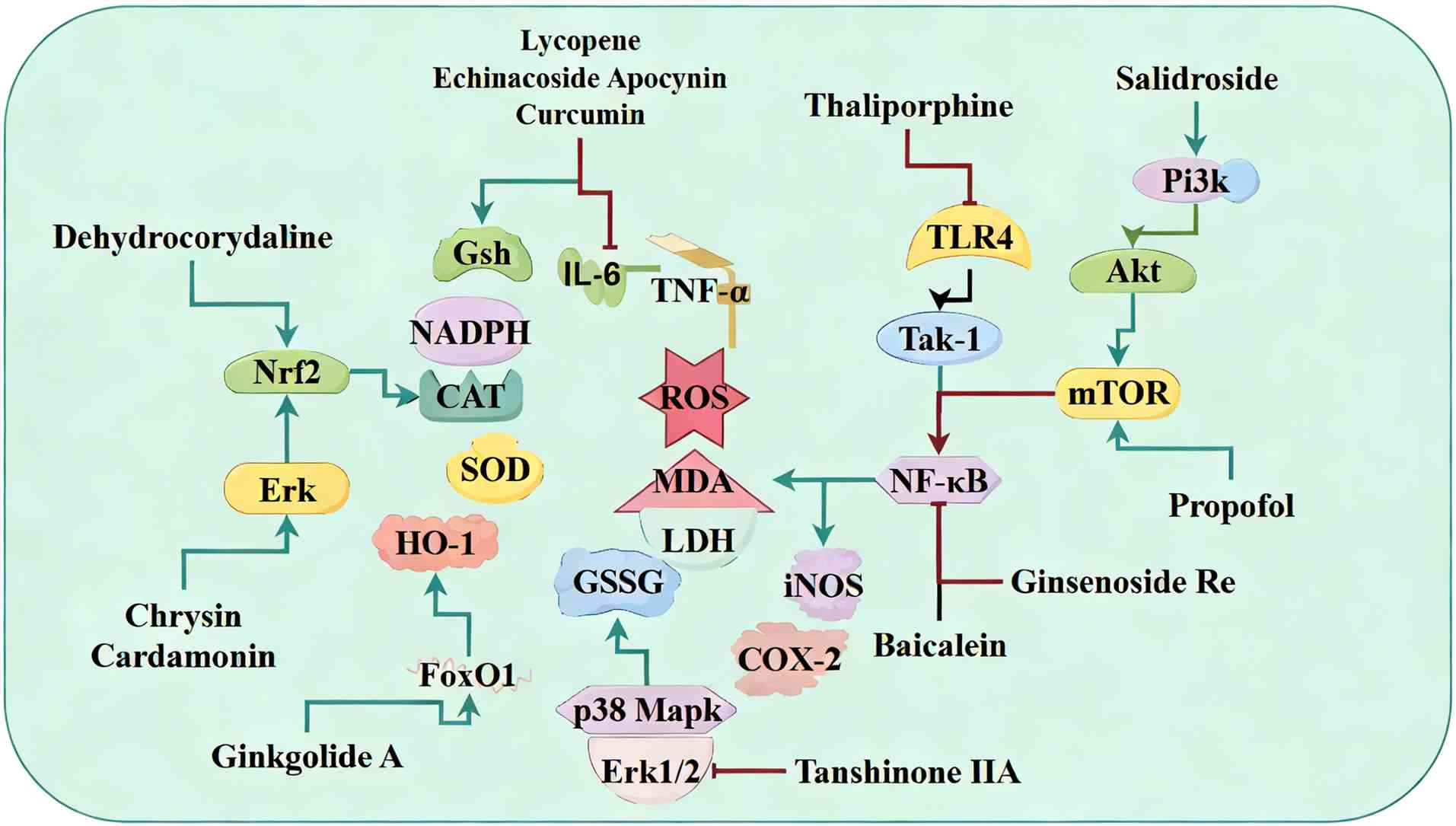 Additional natural products modulate oxidative stress via unique pathways. In LPS-induced sepsis, ginkgolide A activates FoxO1 and downstream effectors such as Kruppel-like factor 15, thioredoxin 2), Notch1(Notch receptor 1), XBP1(X-box binding protein 1), which upregulates antioxidant enzymes and preserves mitochondrial function (194). Tanshinone IIA inhibits ERK1/2 and p38 MAPK phosphorylation, decreases NOX2 expression and lowers MDA and ROS levels to alleviate cardiac dysfunction (195).