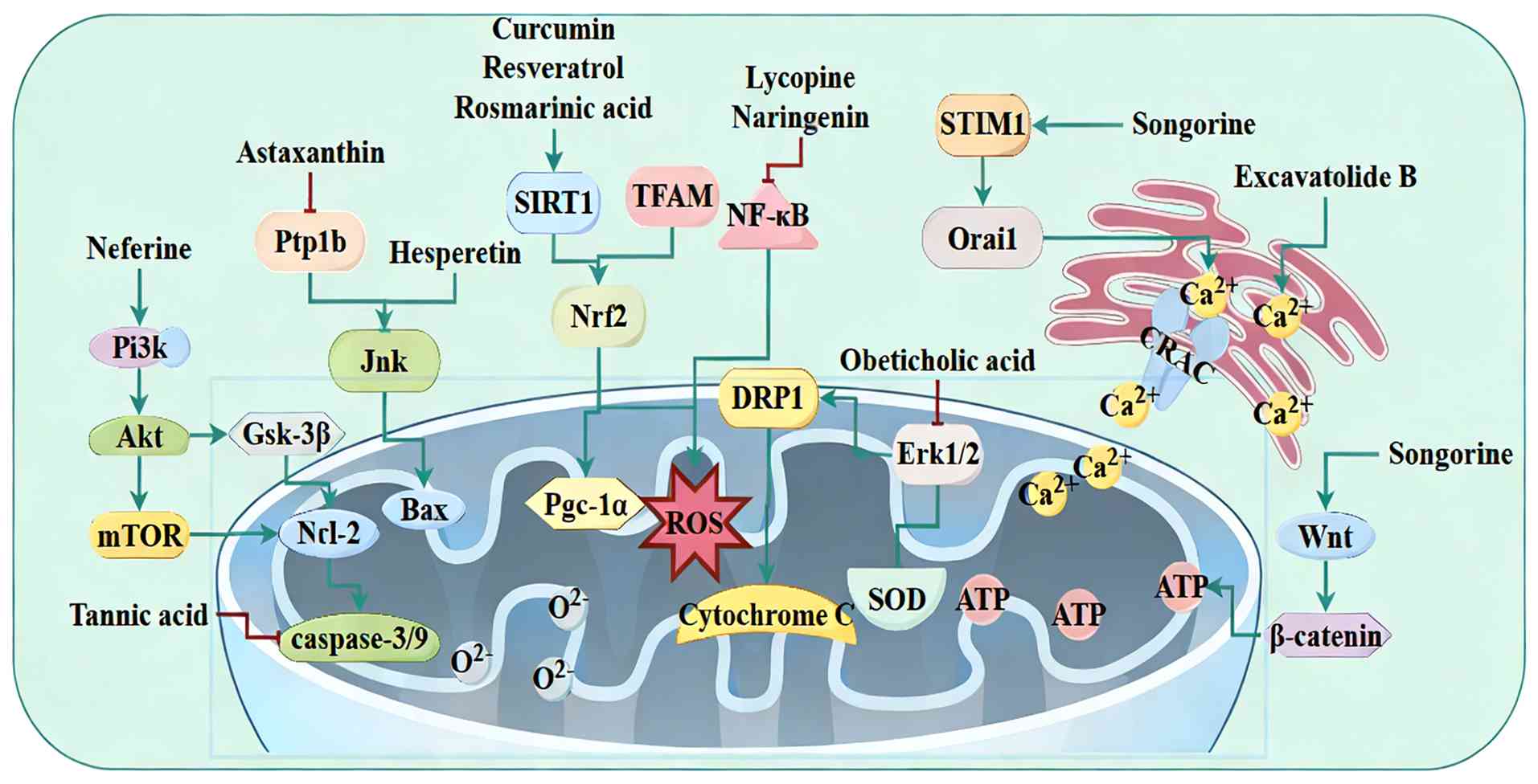 In LPS-treated septic mice, verbascoside promotes mitochondrial biogenesis and morphological repair, thereby improving cardiac function (208). Silibinin also decreases CCR2 levels and activates LXRα (Liver X receptors) signaling to dampen inflammation and oxidative damage while improving mitochondrial function (209,210). Additionally, chicoric acid inhibits α-tubulin acetylation and NLRP3 inflammasome assembly, indirectly restoring mitochondrial architecture and alleviating myocardial injury (211). Songorine also activates Wnt/β-catenin signaling to boost mitochondrial biogenesis and suppress inflammation and apoptosis, thereby improving LVEF and FS (212). Furthermore, excavatolide B modulates intracellular and extracellular Ca2+ channels to reverse calcium dysregulation and repair mitochondrial structure in septic hearts (213). Salvianolic acid B induces an ATF5-mediated mitochondrial unfolded protein response (UPRmt), prevents excessive mitochondrial fission, preserves membrane potential and significantly enhances contractile function and mitochondrial ultrastructure (214).