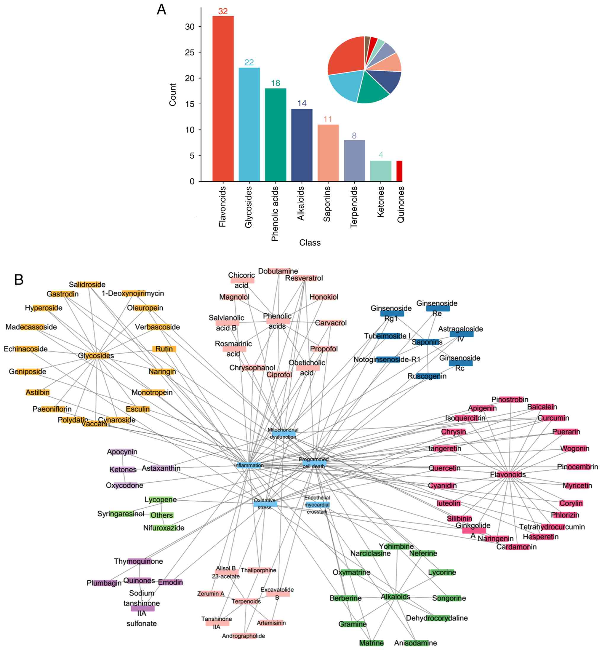 Current clinical management of SIMD follows the Surviving Sepsis Campaign Guidelines, focusing on fluid resuscitation, broad-spectrum antibiotics and vasopressors. Inotropes or β-blockers may be used as adjunctive therapies, but they typically yield only transient hemodynamic benefits and can increase myocardial oxygen demand or provoke arrhythmia (5). Given the intertwined inflammation-oxidation-mitochondria-apoptosis network in SIMD, single-target drugs are unlikely to provide comprehensive cardioprotection. However, natural products offer promising multi-target interventions with low toxicity profiles (10). Traditional compounds such as flavonoids, glycosides, alkaloids and saponins exhibit anti-inflammatory, antioxidant, antiapoptotic and mitochondrial-restorative effects. Preclinical study demonstrates their capacity to attenuate key aspects of SIMD pathology (10); for example, curcumin has been found to have extensive cardiovascular protective effects by regulating endothelial function (10).
