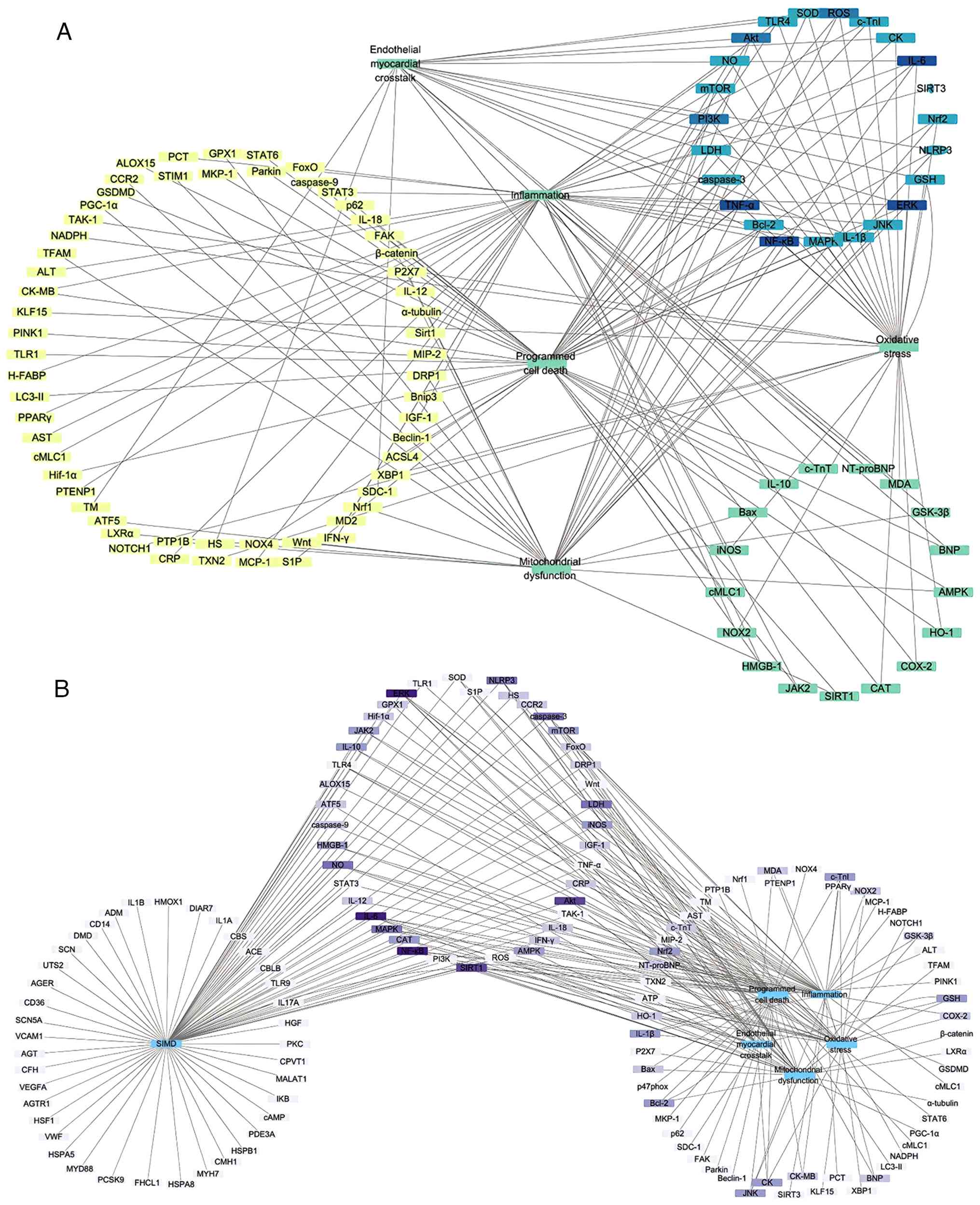 To evaluate how natural product targets align with known SIMD genes, 'sepsis', 'myocardial injury', and 'myocardial dysfunction' were in the Online Mendelian inheritance in Man and GeneCards databases (8,10). This search yielded over 350 unique disease-associated genes, with 41 common targets (Fig. 7B). High-frequency targets included iNOS (NOS2), NF-κB, MAPK family members (JNK, ERK1/2), PI3K/Akt/mTOR, NLRP3, SIRT1 and STAT3.