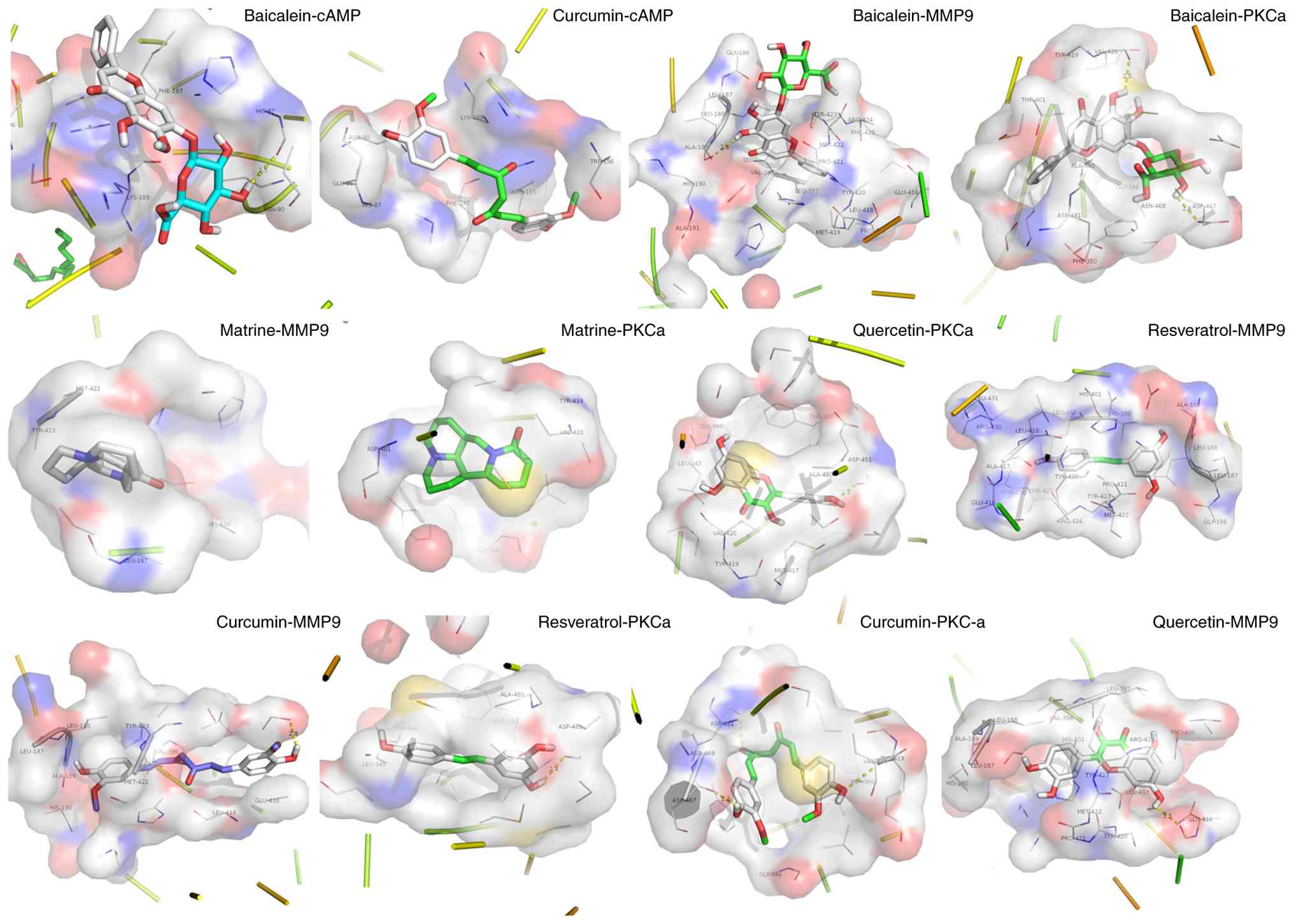 To identify additional molecular targets for natural products in SIMD, molecular docking was performed for three proteins not yet validated in vitro or in vivo: cAMP-dependent protein kinase (cAMP), MMP9 and PKC). A total of five representative ligands (baicalein, quercetin, curcumin, matrine and resveratrol) were drawn in ChemDraw (14.0, revvitysignals. com/products/research/chemdraw), energy-minimized using the Molecular mechanics 2 force field, and docked to each target with AutoDock Vina (1.1.2, github.com/ccsb-scripps/AutoDock-Vina). The lowest-energy poses exhibiting the most favorable orientations were selected for analysis (238). All five compounds bound tightly to both MMP9 and PKC, with calculated binding energies <-8.0 kcal/mol (Fig. 8). Baicalein and curcumin also demonstrated notable affinity for PKA, with binding energies <-5.0 kcal/mol, suggesting potential direct modulation of this kinase. Key interacting residues and hydrogen-bond contacts are detailed in Table SII. These findings indicate that multitarget natural products may exert cardioprotective effects not only through established anti-inflammatory and antioxidant pathways but also by directly engaging cAMP-dependent protein kinase, MMP9 and PKC. This in silico evidence lays the groundwork for experimental validation of these novel interactions.