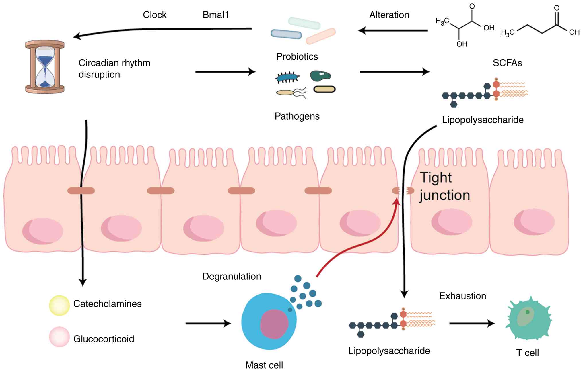 Circadian imbalance also directly impairs the intestinal epithelial barrier. Both genetic clock disruption and environmental light and dark phase misalignment increase epithelial permeability, facilitate endotoxin translocation and trigger systemic inflammatory responses, thereby creating an anatomical route for gut-derived molecules to enter the circulation (28). Classical sleep deprivation model further shows that progressively sleep restricted rats develop cultivable bacteria in tissue that is normally sterile, which supports translocation of microbes and their components across compromised barriers (29). Human study demonstrates that partial nocturnal sleep loss raises circulating norepinephrine and epinephrine levels, reflecting heightened sympathetic activity that is associated with inflammatory susceptibility (30). At the mucosal level, mast cell tryptase activates epithelial protease-activated receptor 2 to increase paracellular permeability, providing a cellular basis for stress-induced tight junction disruption and barrier leak (31). These barrier and inflammatory alterations align with pancreatic tumor biology. In a mouse model of PDAC, increased gut permeability elevates LPS levels in both the circulation and tumor tissue. The rise in LPS coincides with T cell infiltration while simultaneously inducing T cell exhaustion and loss of effector function, together establishing an immunosuppressive tumor microenvironment (P<0.05) (32).