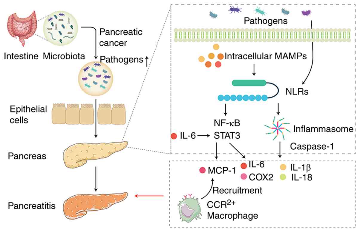 The pro-inflammatory effects of microbes involve pattern recognition receptors (PRRs) and their associated signaling molecules. NOD-like receptors (NLRs), which are cytosolic PRRs, activate NF-κB signaling pathways upon recognition of microbial-associated molecular patterns (Fig. 2). This activation not only triggers NF-κB signaling but also promotes inflammasome formation (94). One of the key components of activated inflammasomes is caspase-1, which facilitates the cleavage and maturation of pro-inflammatory cytokines, such as IL-1β and IL-18 (95). Inflammasomes are key regulators of the host defense against pathogen invasion and maintaining intestinal microbial balance. Mice lacking NLRs exhibit alterations in gut microbiota and microbial dysbiosis, which leads to the development of inflammatory disease (96). Mice with NOD1, Nlrp3 or caspase-1 knockout show reduced acute pancreatitis induced by cerulein, indicating the key role of inflammasomes in the promotion of pancreatitis (97). Moreover, NOD1 responds to gut microbiota and promotes the activation of NF-κB and STAT3. Activation of these pathways enhances the production of monocyte chemoattractant protein-1 (MCP-1), which recruits C-C chemokine receptor type 2-posotive (CCR2+) inflammatory cells to the pancreas, thereby initiating pancreatitis (98). STAT3 is a key participant in pancreatitis and is activated in cerulein-challenged mice. In wild-type mice, STAT3 activation is transient and returns to baseline as the pancreas recovers from cerulein-induced acute pancreatitis. However, in KC mice (mice with KRAS mutations in pancreatic epithelial cells), STAT3 activation persists due to the recruitment of myeloid cells, which secrete IL-6, activating STAT3 in the pancreas (99,100). Persistent STAT3 activation promotes the expression of cytokines, chemokines and other mediators, such as IL-6 and COX2, further driving pancreatic cancer progression (100,101). Additionally, STAT3 induces the expression of MMP-7, which facilitates tumor metastasis (99). Germ-free mice exhibit fewer gastrointestinal malignancies, potentially due to decreased tumor-associated inflammation (102). This anti-tumor effect was also confirmed in mice treated with antibiotics to decrease gastrointestinal microbiota (102). Although the aforementioned studies have not been verified in pancreatic cancer models, similar evidence suggests that antibiotic-induced gut sterilization alleviates acute pancreatitis (91).