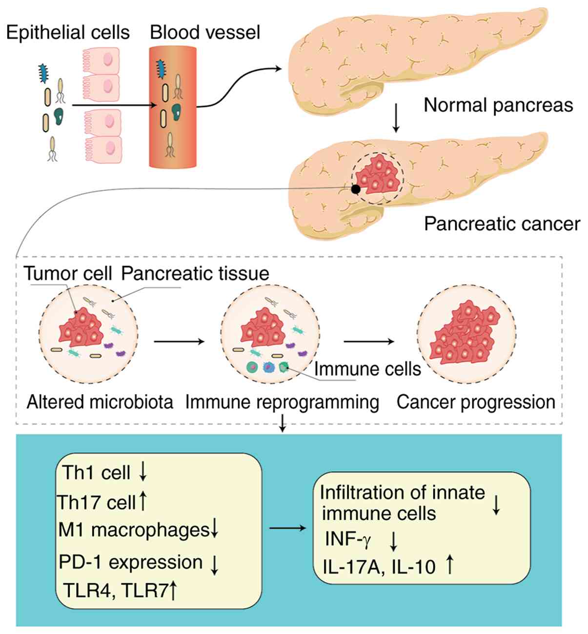 From 1990 to 2017, the incidence of pancreatic cancer has increased (age-standardized incidence rate, 5.0/100,000 person-years in 1990 to 5.7 in 2017), positioning it among the most lethal types of human malignancy, largely due to its poor prognosis (1). Although progress has been made in contemporary medical practices, the 5-year survival rate for this disease has improved marginally, rising from <5% in 1990 to ~10% by 2021 (2). This limited survival benefit is primarily associated with delayed detection, as a majority of patients are diagnosed at a later stage of the disease. In cases where early diagnosis is achieved, ~20% of individuals meet the criteria for surgical resection. For those who undergo surgery, the 5-year survival rate may increase to ~25% (3). As the risk of pancreatic cancer is associated with aging, the prevalence of the disease is projected to escalate in response to the global aging trend (4). Anatomically, the pancreas is connected to the gastrointestinal system via the pancreatic duct, which facilitates the retrograde movement of intestinal microorganisms into the pancreatic ductal system. This microbial translocation and resulting dysbiosis may contribute to sustained inflammatory responses, offering a potential explanation for the higher frequency of pancreatic ductal adenocarcinoma (PDAC) in the pancreatic head compared with its body or tail (5). The gut microbiota, a complex and essential component of the human organism, comprises >1×1014 microbial cells (6). Certain bacteria-associated metabolites, such as nitrosamines, may modulate the immune landscape and influence resistance to treatment, thereby serving a role in the development and progression of pancreatic cancer (7).