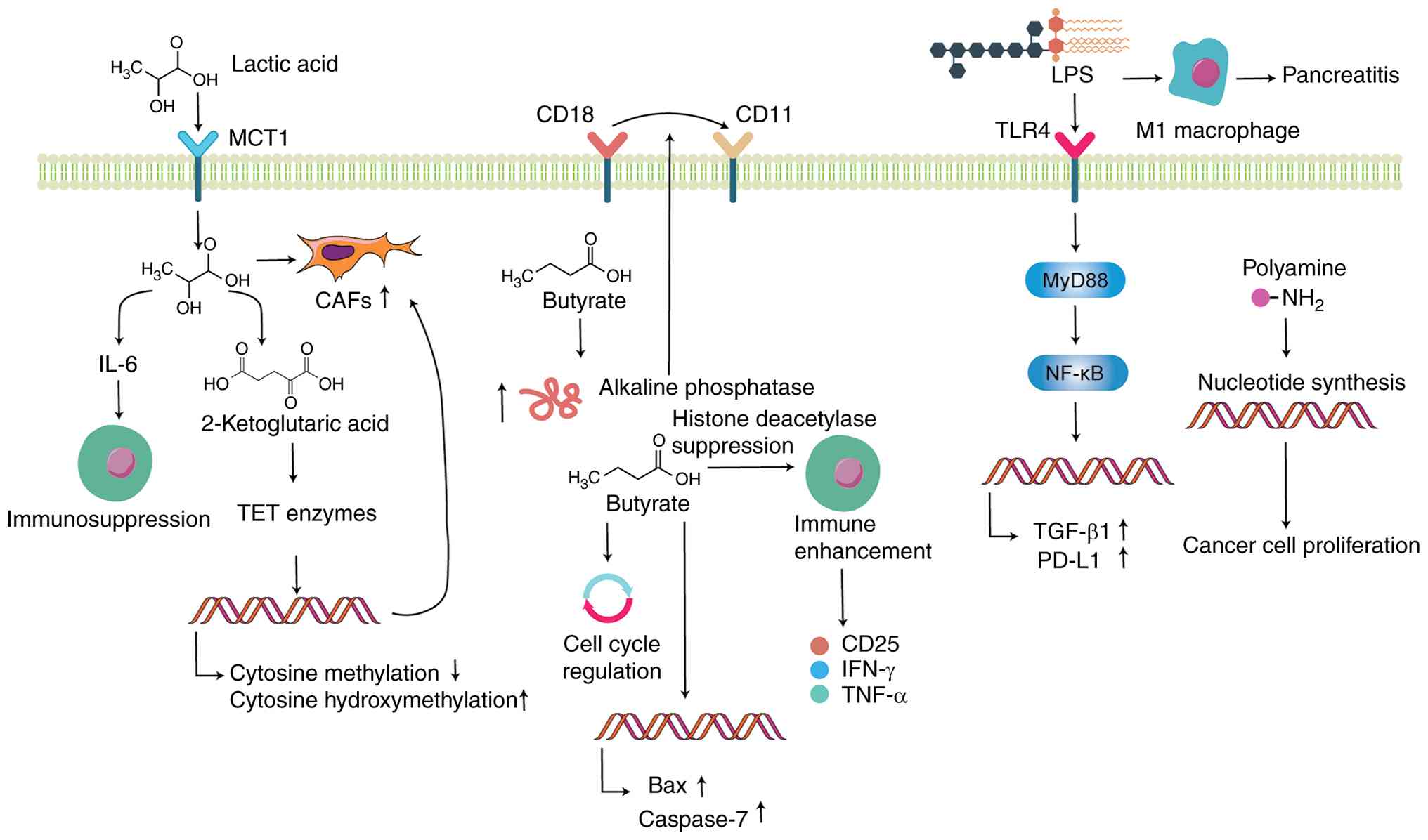 Lactate induces the production of α-ketoglutarate in mesenchymal stem cells (MSCs). This activates 10-11 translocation enzymes, resulting in decreased DNA methylation and increased hydroxymethylation, an epigenetic modification that promotes MSC differentiation into CAFs, contributing to the invasive behavior of PDAC (111). Butyrate enhance alkaline phosphatase activity and facilitates the transformation of CD18 into CD11 cells, which contributes to the differentiation of pancreatic cancer cell lines and suppression of PDAC cell proliferation and invasion (112). Moreover, a butyrate compound conjugated with hyaluronic acid induces cell cycle arrest at both the G0/G1 and G2/M phases. This compound also promotes the expression of pro-apoptotic proteins such as Bax and caspase-7, while concurrently reducing the levels of angiogenesis-associated factors including VEGF-A165 and VEGF-D, thereby inhibiting the proliferation of the MIA PaCa-2 pancreatic cancer cell line (113). In a study by Ren et al (62), gut microbiota profiles of patients with pancreatic cancer and healthy controls were compared using MiSeq sequencing. The results indicated a higher abundance of pathogenic and LPS-producing bacteria in patients with pancreatic cancer patients, whereas levels of beneficial microbes, including butyrate-producing species and probiotics, are diminished (62). These findings are in line with the research by Kanika et al (114), who reported that sodium butyrate, a histone deacetylase inhibitor, decreases pancreatic fibrosis and injury induced by L-arginine in Wistar rats. Additionally, an in vitro study (115) has shown that treating cytotoxic T lymphocytes and chimeric antigen receptor T cells with pentanoate and butyrate can enhance their anti-tumor functions against pancreatic cancer. This is achieved through inhibition of class I histone deacetylase activity and upregulation of effector molecules such as CD25, IFN-γ and TNF-α (115). The aforementioned studies suggest that different SCFA components may have distinct effects on pancreatic cancer. Future research should focus on modulating the gut microbiota, such as decreasing levels of lactate-producing microbes and increasing levels of butyrate-producing microbes, to regulate pancreatic cancer progression. However, further experimental studies are needed.