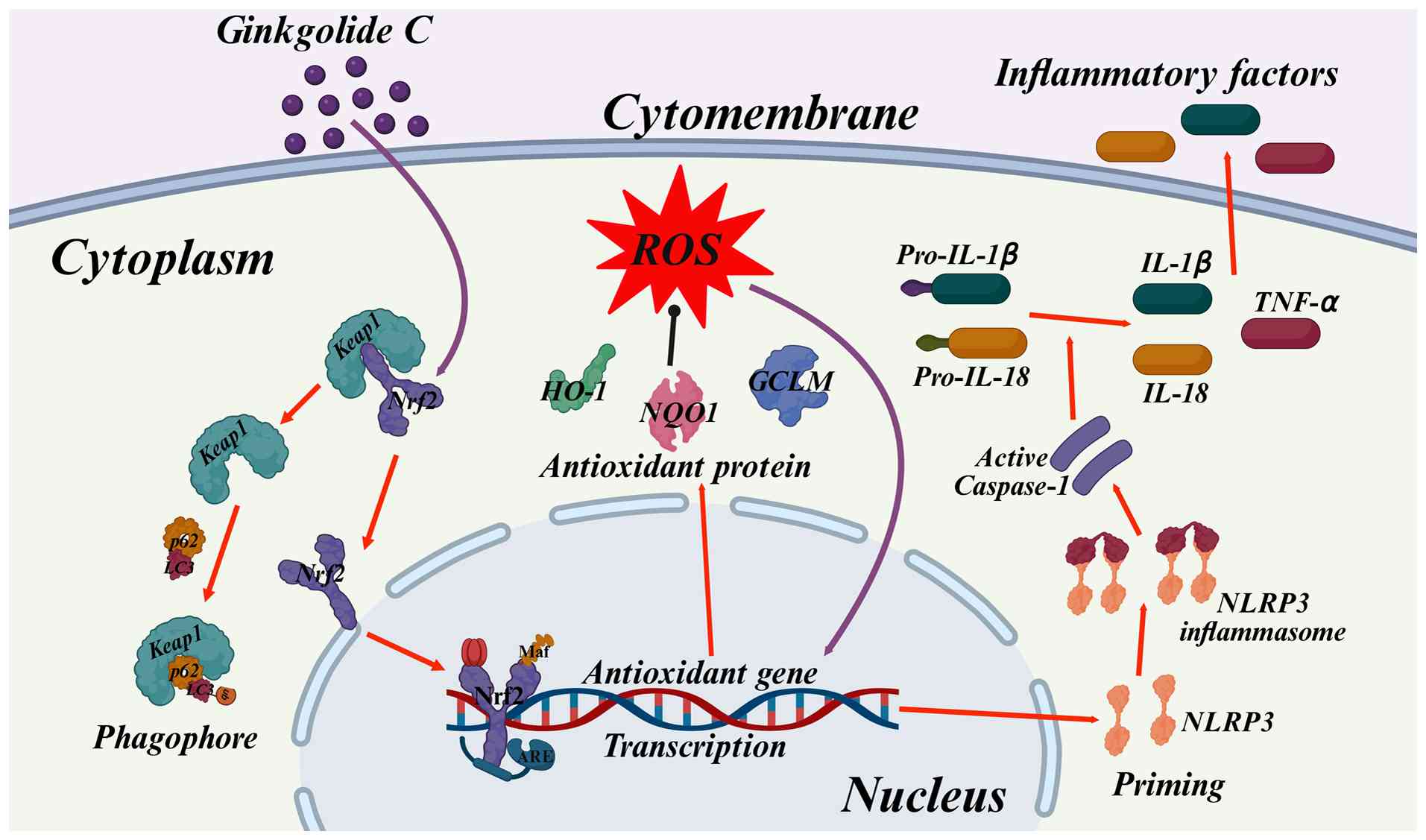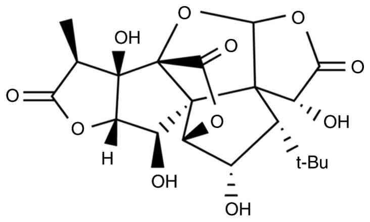 Ginkgo biloba L. (Ginkgoaceae; MPNS-verified) a unique tree species native to China, is valued for its neuroprotective properties in addressing cardio-cerebrovascular diseases and neurological disorders (16). Contemporary pharmacological research has elucidated the multifaceted pharmacodynamics of foliar extracts, demonstrating their capacity to confer dose-dependent cardioprotection, modulate neurovascular homeostasis, and suppress neoplastic proliferation (17). Of particular scientific interest is ginkgolide C (GC) (Fig. 1), a unique terpenoid trilactone isolated from Ginkgo biloba leaves characterized by its distinctive pentacyclic structure. Previous studies have characterized GC as a pleiotropic therapeutic agent, demonstrating potent anti-inflammatory efficacy and the capacity to confer multi-organ protection in experimental models of cardiac and cerebral ischemia-reperfusion injury (18,19). Atherosclerotic progression is increasingly recognized as a critical pathogenic link between ischemic events and cerebral/cardiovascular comorbidities, driven by interconnected pathways of endothelial dysfunction and amplified oxidative stress (20). However, the potential of GC to mitigate atherosclerotic lesions through suppression of ROS-induced NLRP3 inflammasome activation and subsequent attenuation of inflammatory cascades remains experimentally unestablished.
