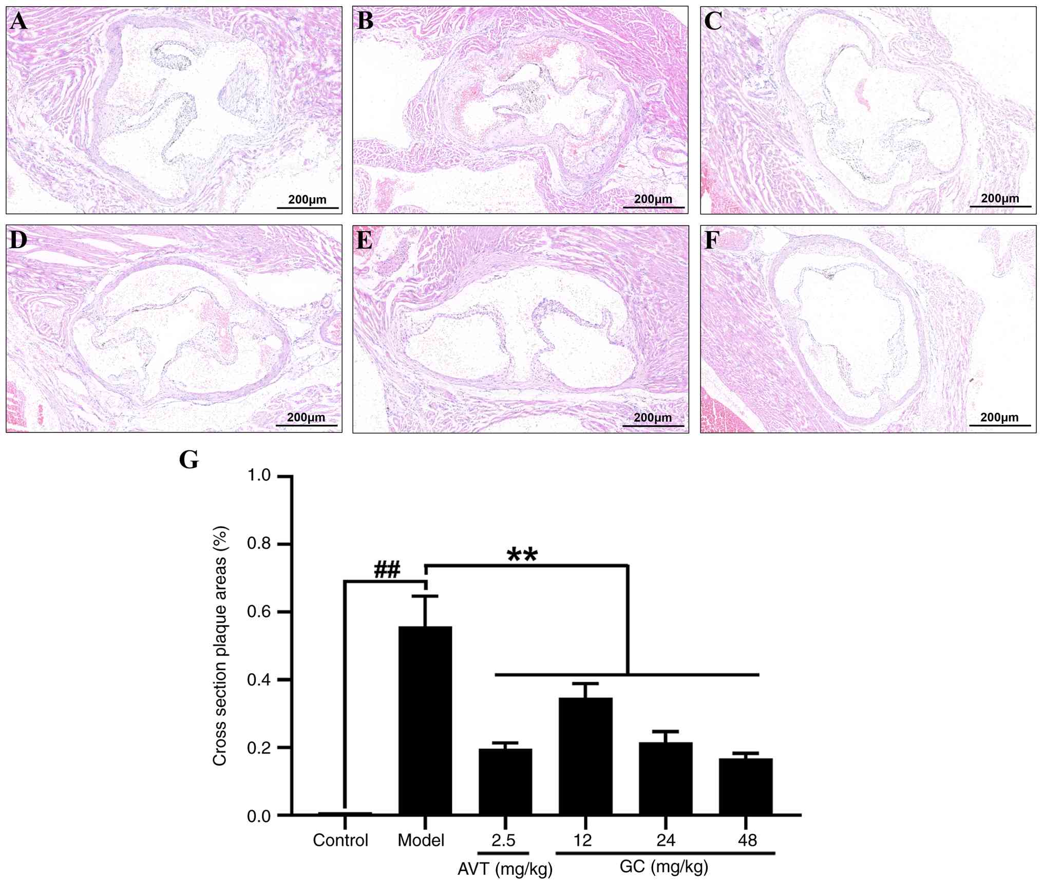 The result in Table I showed that the blood lipid levels in model group were markedly changed (TG: 5.58±0.26 mM; TC: 41.59±5.49 mM; LDL-C: 16.14±2.41 mM and HDL-C: 1.46±0.24 mM, all P<0.01 vs. control group). 2.5 mg/kg AVT and 12, 24, 48 mg/kg GC significantly improved the blood lipid levels (all P<0.01 vs. model group). The findings revealed that GC exhibited hypolipidemic effects and attenuated atherosclerotic development.