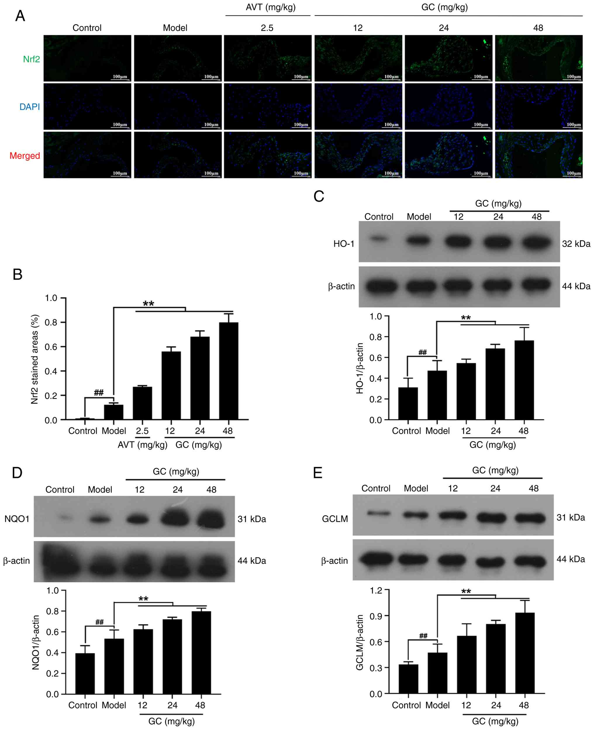 As shown in Fig. 5A and B through IF analysis, Nrf2 expression demonstrated relatively low baseline levels in the control group. The model group exhibited marginal elevation in Nrf2 expression compared with the control group. However, GC administration at doses of 12, 24 and 48 mg/kg induced significant upregulation of Nrf2 expression levels (all P<0.01 vs. model group). Moreover, 2.5 mg/kg AVT slightly elevated the expression of Nrf2 (P<0.01 vs. model group). Furthermore, baseline expression levels of HO-1, NQO1 and GCLM were markedly diminished in the control group. While the model group demonstrated modest elevation of these antioxidant markers relative to controls, 12, 24, 48 mg/kg GC produced statistically significant inductions in HO-1, NQO1 and GCLM expression (Fig. 5C-E; all P<0.01 vs. model group).