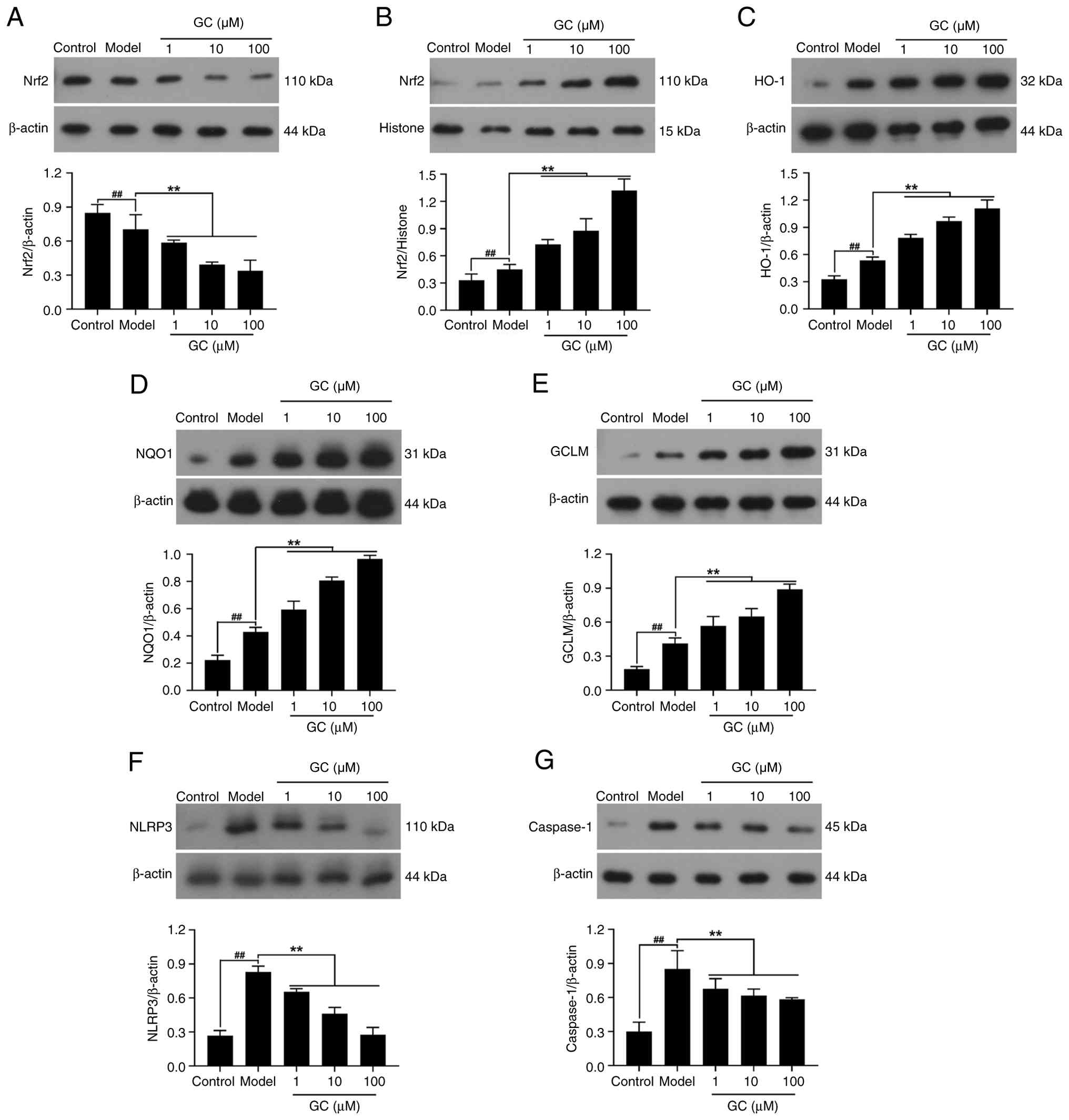 As revealed in Fig. 8A and B, Nrf2 was primarily localized in the cytoplasm with barely detectable nuclear levels in control cells. By contrast, ox-LDL stimulation promoted its nuclear translocation. However, GC (1, 10, 100 μM) significantly enhanced the cytoplasmic-to-nuclear translocation of Nrf2. Therefore, GC significantly activated the Nrf2 signaling pathway, with increased cytoplasmic-to-nuclear translocation of Nrf2 leading to upregulation of HO-1, NQO1 and GCLM expression levels (Fig. 8C-E). The results in Fig. 8F and G showed that ox-LDL stimulation notably upregulated the expression of NLRP3 and Caspase-1. Whereas treatment of 1, 10 and 100 μM GC demonstrated dose-dependent suppression of NLRP3/Caspase-1 cascade activation.