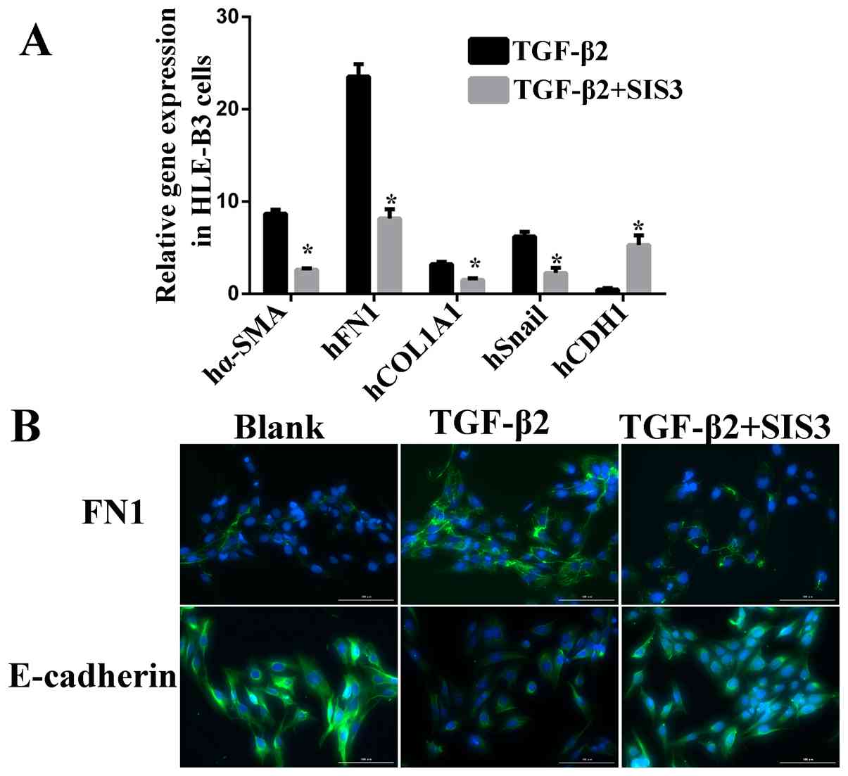 After having asked the authors to explain the apparent anomalies in these figures, they realized that they had been assembled erroneously. Corrected versions of Figs. 2 and 3, now showing the correct data for the 'TGF-β2-SIS3/E-cadherin' experiment in Fig. 2C and the GAPDH western blots for the '28 days' experiment in Fig. 3B, are shown opposite and on the next page. The errors made in assembling Figs. 2 and 3 did not grossly affect either the results or the conclusions reported in this paper. All the authors agree with the publication of this corrigendum, and are grateful to the Editor of International Journal of Molecular Medicine for allowing them the opportunity to present this; moreover, the Editor and the authors apologize to the readership for any inconvenience caused.