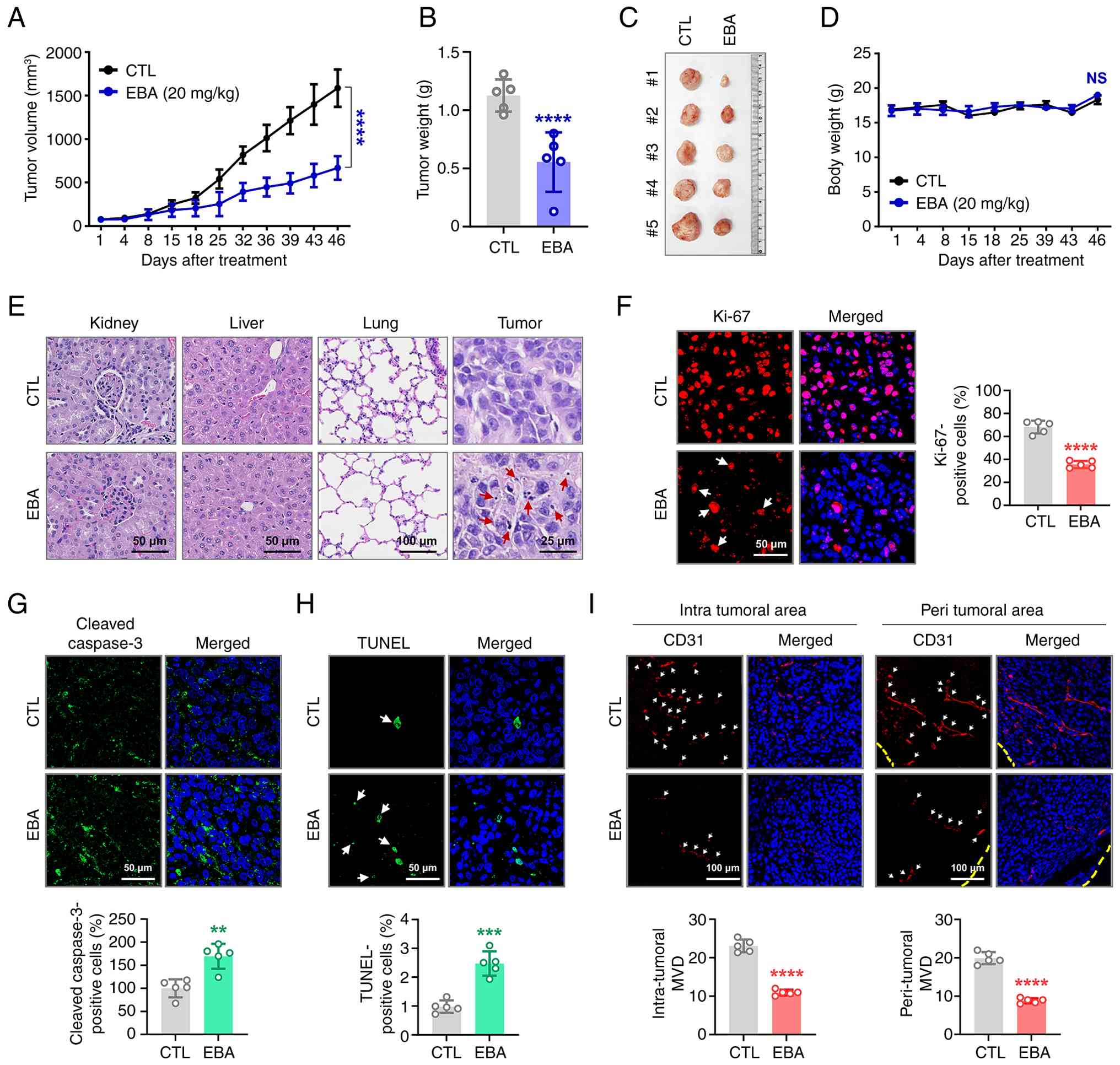 To assess the physiological relevance of the in vitro findings, the present study established a trastuzumab-resistant JIMT-1 xenograft model to evaluate the antitumor effect of ebastine in vivo (Fig. 4A). When tumor volumes reached ~50 mm3, mice were administered ebastine (20 mg/kg, every other day) or vehicle control. At day 46, ebastine led to a significant suppression of tumor volume (Fig. 4A) and tumor weight (Fig. 4B and C), without affecting body weight (Fig. 4D). Histopathological examination using hematoxylin and eosin (H&E) staining revealed no observable abnormality in the kidney, liver or lung tissue of ebastine-treated mice compared with controls. Tumor tissue from the ebastine-treated group exhibited a notable number of cells with nuclear condensation and fragmentation, indicative of treatment-induced apoptosis (Fig. 4E). Immunohistochemical analysis revealed a significant reduction in the Ki-67 proliferation index following ebastine treatment (Fig. 4F), supporting its antiproliferative activity. Apoptosis induction was evidenced by a significant increase in DNA fragmentation, as determined by the in situ TUNEL assay (Fig. 4H), accompanied by enhanced caspase-3 cleavage (Fig. 4G). The antiangiogenic potential of ebastine was assessed by quantifying microvessel density using the endothelial marker CD31. A significant decrease in the number of CD31-positive microvessels was observed in both intratumoral and peritumoral (Fig. 4I) regions following ebastine treatment.