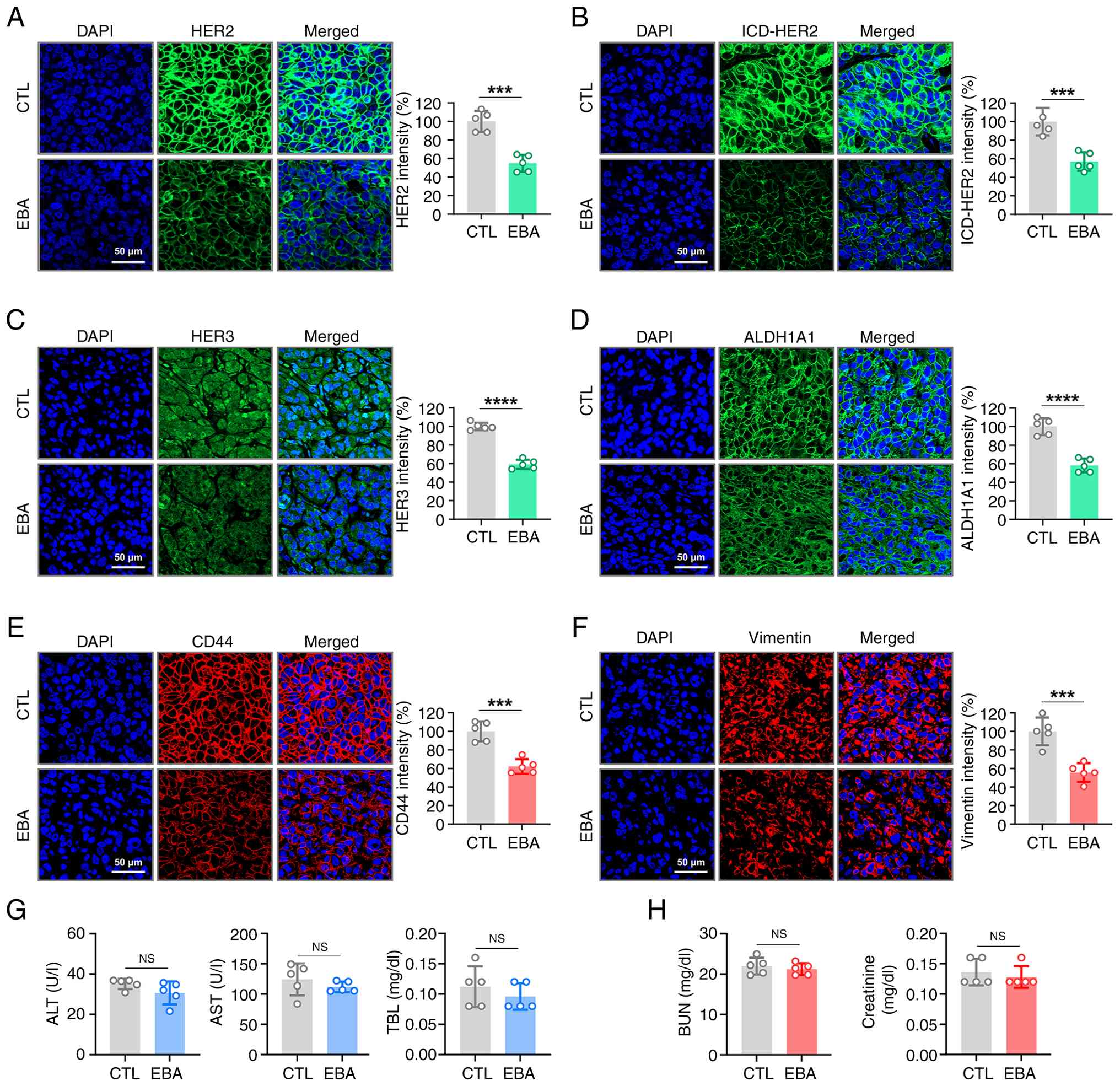 Ebastine was purchased from Selleck Chemicals. Propidium iodide (PI), Triton X-100 and DMSO were obtained from Sigma-Aldrich (Merck KGaA). Phosphatase and protease inhibitor cocktail tablets were obtained from Roche Applied Sciences. RNase A was purchased from Invitrogen (Thermo Fisher Scientific, Inc.). Primary antibodies were as follows: Ki-67 (cat. no. ab16667), CD31 (cat. no. ab28364), ALDH1A1 (Abcam; cat. no. ab52492), Bcl-2 (Abcam; cat. no. ab692) and CD44 (all Abcam; cat. no. ab254530); HER2 (Cell Signaling Technology, Inc.; cat. no. 2165), HER3 (Cell Signaling Technology, Inc.; cat. no. 12708), phosphorylated (p-)HER2 (Y1221/1222; Cell Signaling Technology, Inc.; cat. no. 2243), p-HER3 (Y1289; Cell Signaling Technology, Inc.; cat. no. 2842), Akt (Cell Signaling Technology, Inc.; cat. no. 9272), p-Akt (S473; Cell Signaling Technology, Inc.; cat. no. 4060), PARP (Cell Signaling Technology, Inc.; cat. no. 9542), cleaved PARP (Cell Signaling Technology, Inc.; cat. no. 5625), caspase-3 (Cell Signaling Technology, Inc.; cat. no. 7148), -7 (Cell Signaling Technology, Inc.; cat. no. 12827) and -8 (Cell Signaling Technology, Inc.; cat. no. 4790), cleaved caspase-3 (Cell Signaling Technology, Inc.; cat. no. 9664), -7 (Cell Signaling Technology, Inc.; cat. no. 8438) and -8 (Cell Signaling Technology, Inc.; cat. no. 9496), Bax (Cell Signaling Technology, Inc.; cat. no. 2772) and vimentin (Cell Signaling Technology, Inc.; cat. no. 5741); anti-intracellular domain (ICD) HER2 clone 4B5 (Ventana Medical Systems; cat. no. 790-4493) and GAPDH (Invitrogen; Thermo Fisher Scientific, Inc.; cat. no. MA5-15738). Secondary antibodies included HRP-conjugated anti-mouse (Bio-Rad Laboratories, Inc.; cat. no. 1721011) and anti-rabbit IgG (Bio-Rad Laboratories, Inc.; cat. no. 1706515), as well as Alexa Fluor 594-conjugated goat anti-rabbit IgG (Invitrogen; Thermo Fisher Scientific, Inc.; cat. no. A-11037), Alexa Fluor 488-conjugated goat anti-rabbit IgG (Invitrogen; Thermo Fisher Scientific, Inc.; cat. no. A-11008), Alexa Fluor 594-conjugated goat anti-mouse IgG (Invitrogen; Thermo Fisher Scientific, Inc.; cat. no. A-11032) and Alexa Fluor 488-conjugated goat anti-mouse IgG (Invitrogen; Thermo Fisher Scientific, Inc.; cat. no. A-11001).