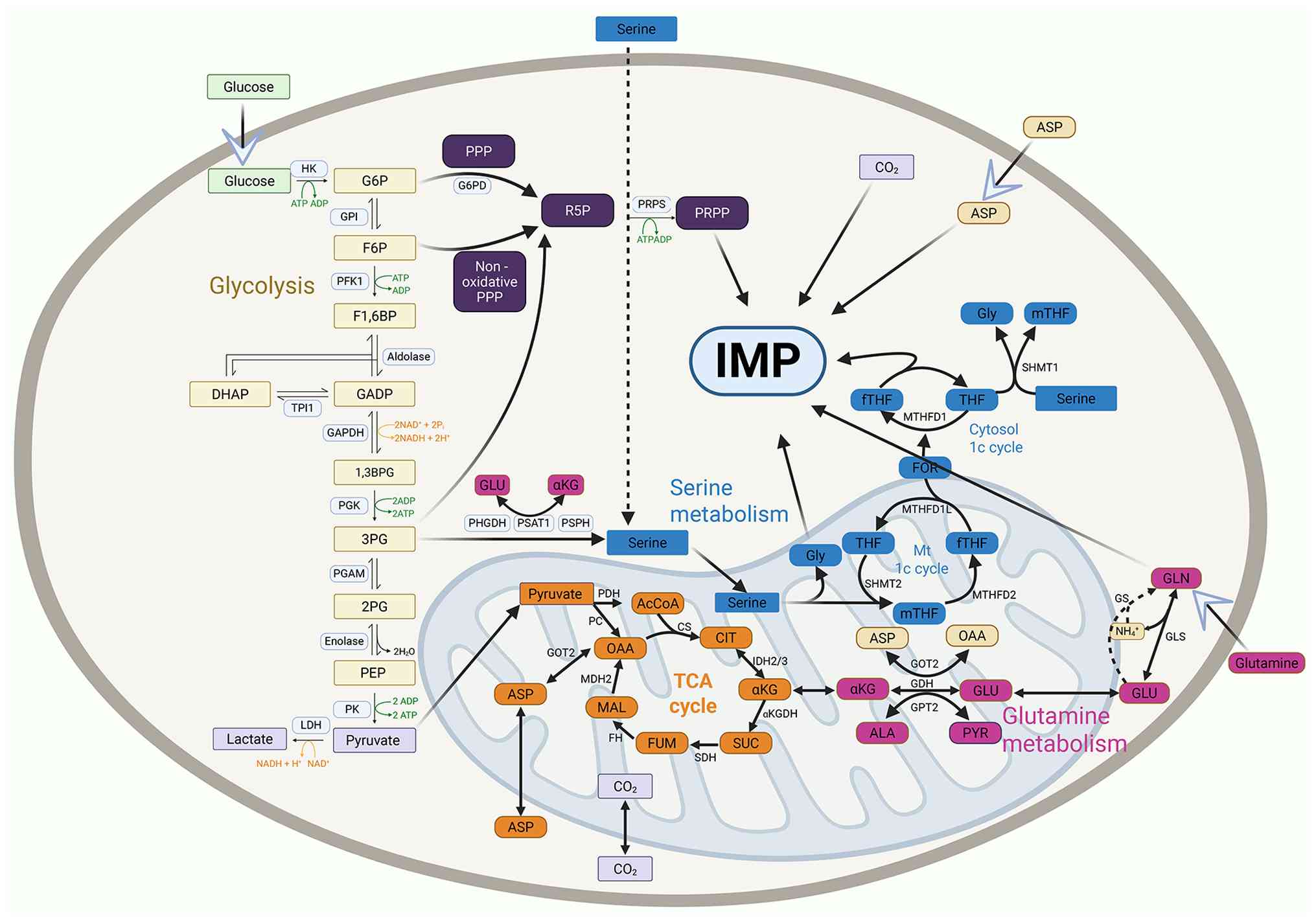 IMP metabolism is a critical node in purine metabolism. The downstream conversion of its metabolites, GMP/GTP, directly or indirectly impacts T-cell activation, myeloid cell polarization and the transmission of adenosine signaling pathways, thereby exerting significant effects on the human immune system.