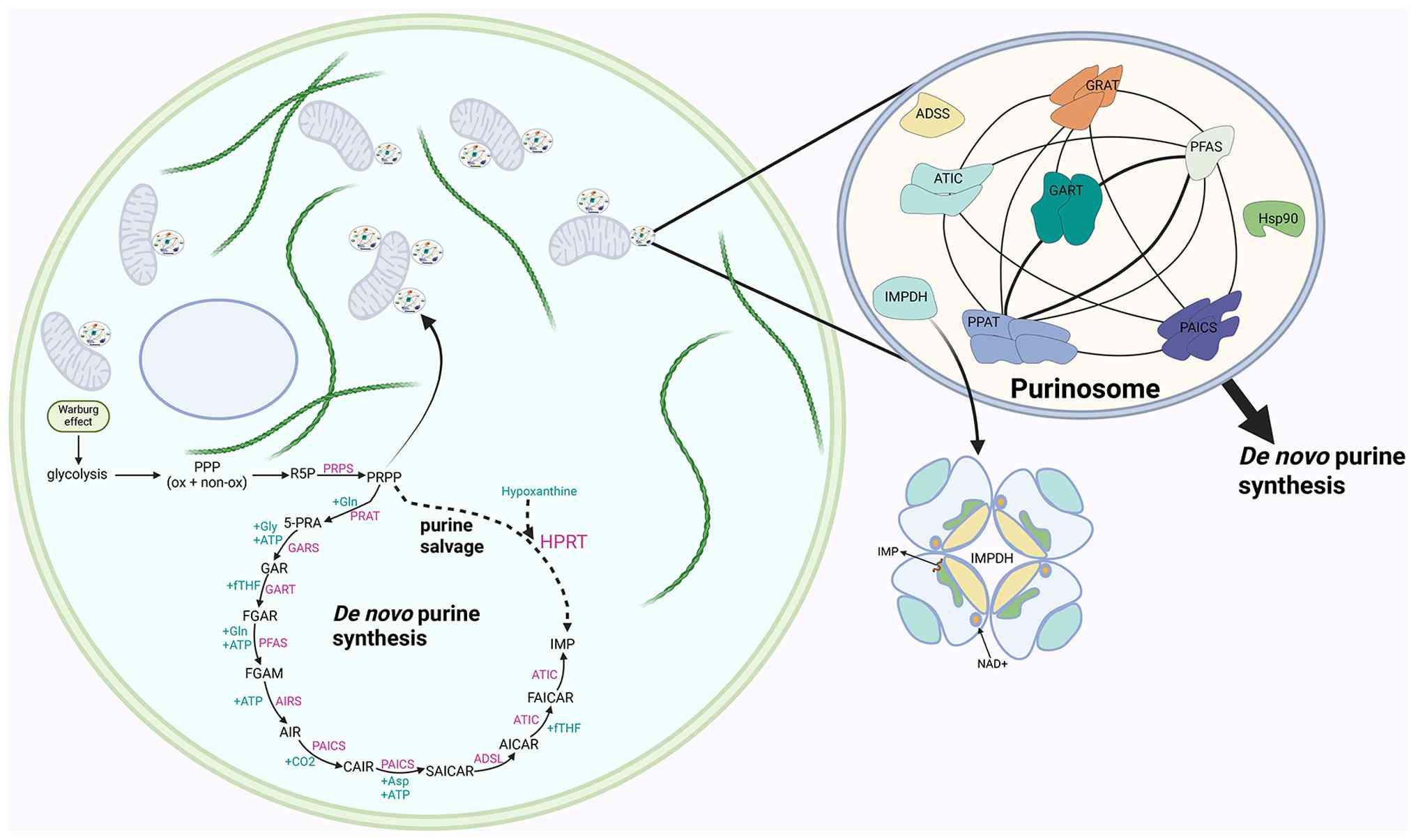 Purinosomes, initially identified in 2008, are dynamic intracellular structures made up of six enzymes involved in de novo purine synthesis. The core scaffold comprises PPAT, GART and FGAMS, while PAICS, ADSL and ATIC are associated with peripheral structures. This spatial organization facilitates metabolic channeling in order to produce IMP and downstream purines to meet cellular demands effectively. Notably, purinosomes are functionally coupled to mitochondria, suggesting a link between de novo purine synthesis and cellular energy metabolism. The primary function of purinosomes in growth-related pathways makes them attractive therapeutic targets, despite the fact that their significance in cancer is still unclear (8,73-75). Its formation is driven by reduced cellular purine levels and increased metabolic demand. Enzymes of the de novo synthesis pathway assemble into purinosomes when cells require high purine levels, such as during G1/S-phase proliferation or when salvage pathways are compromised. This organization improves metabolic efficiency by channeling substrates, limiting diffusion or degradation of intermediates, and increasing de novo synthesis flux by ~50%, thereby increasing IMP production threefold as compared to normal growth conditions. Pyrimidine body production rises by 25% in cells with impaired salvage pathways, such as HGPRT knockout cells, thereby compensating to maintain purine supply. Pathway flux may be markedly more noticeable during the G1 phase of cell proliferation because these investigations are asynchronous (8,76,77). Functional loss of any purinosomes component disrupts its stability and structure (78,79), and purine supplementation causes complete or significant depletion of purinosomes (8). According to time-lapse fluorescence microscopy analysis, the proportion of purinosome-positive cells peaked during the G1 phase, providing essential purine nucleotides for cell growth, and progressively decreases throughout the course of the remaining cell cycle. Interestingly, expression levels of de novo purine synthesis enzymes did not change across the cell cycle, suggesting that mechanisms other than purinosome assembly and disassembly may also regulate this process (77). Available evidence suggests that a significant portion of purinosomes in purinosome-positive cells localize to mitochondria rather than being randomly distributed throughout the cytoplasm, indicating a close mitochondrial association due to the high energetic needs of purine synthesis. Microtubules provide a structural foundation for purinosome function, as evidenced by the spatial regulation of purinosome assembly being dependent on microtubules. Purinosomes travel along the microtubule network, and microtubule depolymerization disrupts their mitochondrial colocalization, leading to a roughly 50% reduction in the flux of de novo purine synthesis. Super-resolution fluorescence microscopy further revealed colocalization of purinosomes with mitochondria, with at least nine purinosome components located at the microtubule-mitochondria interface. This organization allows purinosomes to directly access ATP, one-carbon units (formate), aspartate and glutamine, thereby maximizing the efficiency of purine synthesis. Notably, purinosome formation is increased by defects in mitochondrial functions, including electron transport or oxidative phosphorylation, whereas excessive purinosome accumulation can impair mitochondrial function (5,80,81). Although the role of purine synthase in cancer has not been extensively studied, it is a promising target for possible treatments due to its crucial involvement in notable cellular growth pathways. Furthermore, its dependence on mitochondria suggests that targeting mitochondria can be a strategy to inhibit purine biosynthesis (8). Additionally, molecular chaperones heat shock protein (HSP70)/HSP90 actively contribute to purinosomes assembly, stability maintenance and functional execution by direct binding, folding assistance and degradation regulation. They serve as essential regulators of the biophysical properties and structural integrity of purinosomes, and they also provide a potential therapeutic strategy targeting purinosomes by interfering with chaperone function (82-84). Tumor cells use mechanisms to regulate the assembly and disassembly of purinosomes or their interactions with other organelles to meet their high IMP demand. Tumor cells use microtubules to assemble purinosomes when IMP is deficient, a crucial adaptive mechanism that enables cancer cells to respond to purine scarcity. The process can be inhibited by docetaxel, a microtubule-stabilizing chemotherapeutic agent (85) (Fig. 3).
