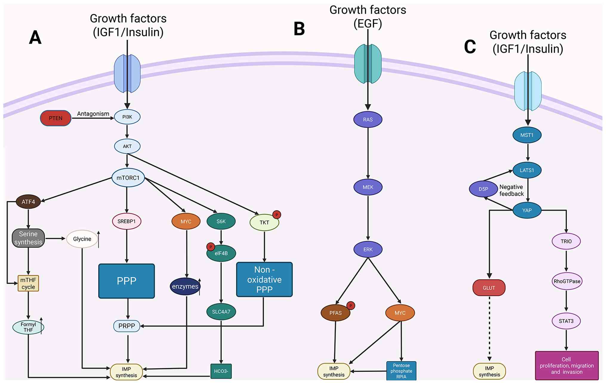Significant progress is being made in studying the regulation of purine synthesis through multiple signaling pathways. Currently, the most commonly acknowledged signaling pathways implicated in IMP synthesis are RAS-ERK, PI3K/AKT-mTORC1 and Hippo-YAP.