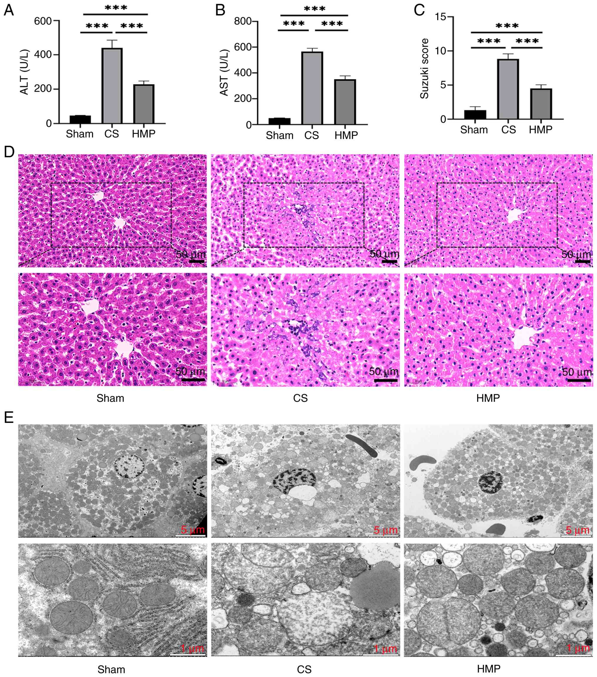 To assess the protective effect of HMP on DCD donor livers, reperfusion fluid of the CS and HMP groups was analyzed. Compared with the CS group, the HMP group showed a significant reduction in AST and ALT levels (Fig. 2A and B). Additionally, staining showed milder liver sinusoidal congestion, less lobular edema and reduced hepatocyte vacuolation and necrosis in the HMP group compared with the CS group (Fig. 2C and D). TEM also showed that mitochondria displayed visible cristae and less swelling and vacuolation in the HMP group compared with CS group (Fig. 2E).