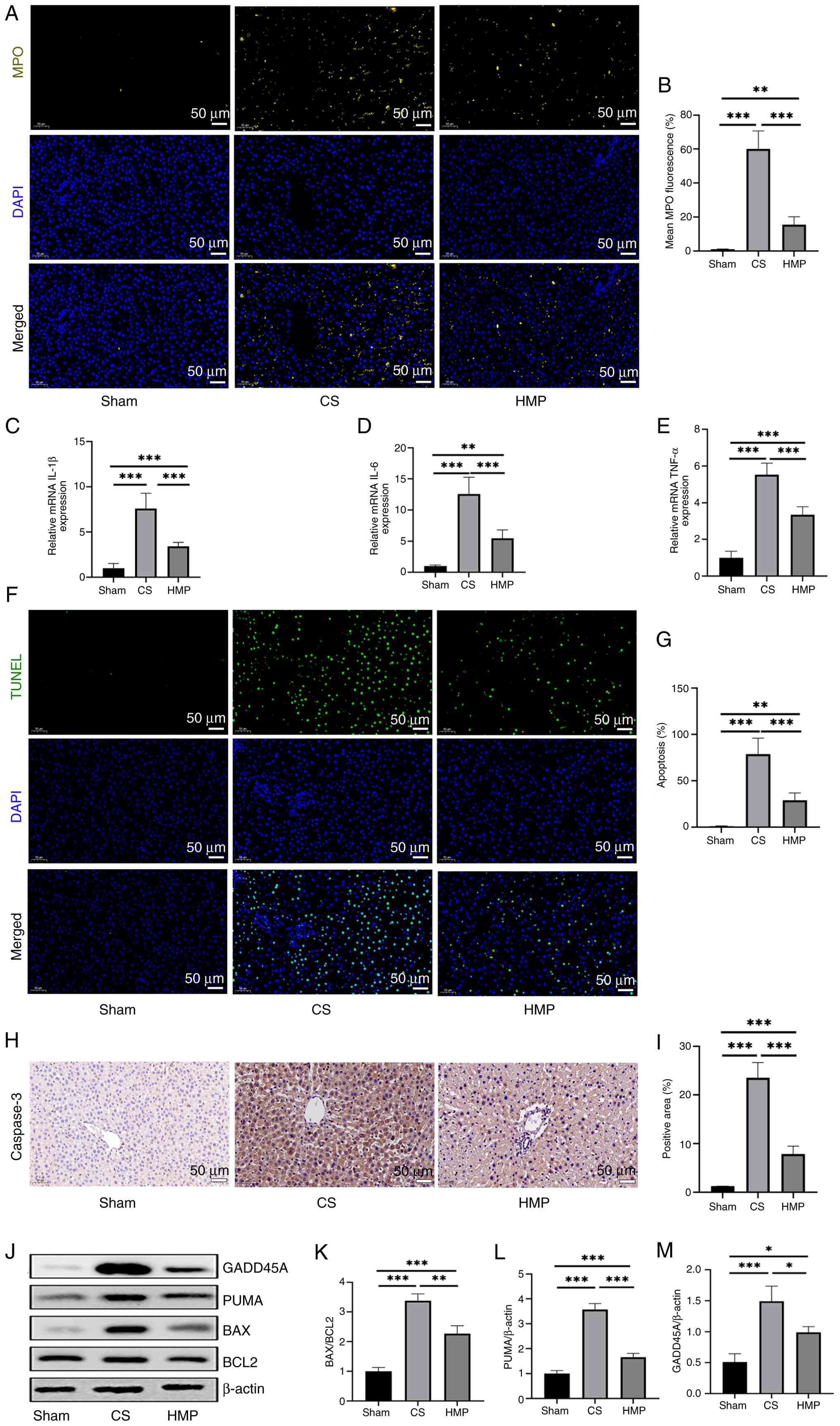To validate the protective effect of HMP on inflammation, IF staining was performed to detect neutrophil infiltration marker MPO. Neutrophil infiltration was significantly higher in the CS than in the HMP group (Fig. 3A and B). Furthermore, the mRNA expression levels of inflammatory factors such as IL-6, IL-1β and tumor necrosis factor (TNF)-α were significantly elevated in the CS group compared with the HMP group (Fig. 3C-E).