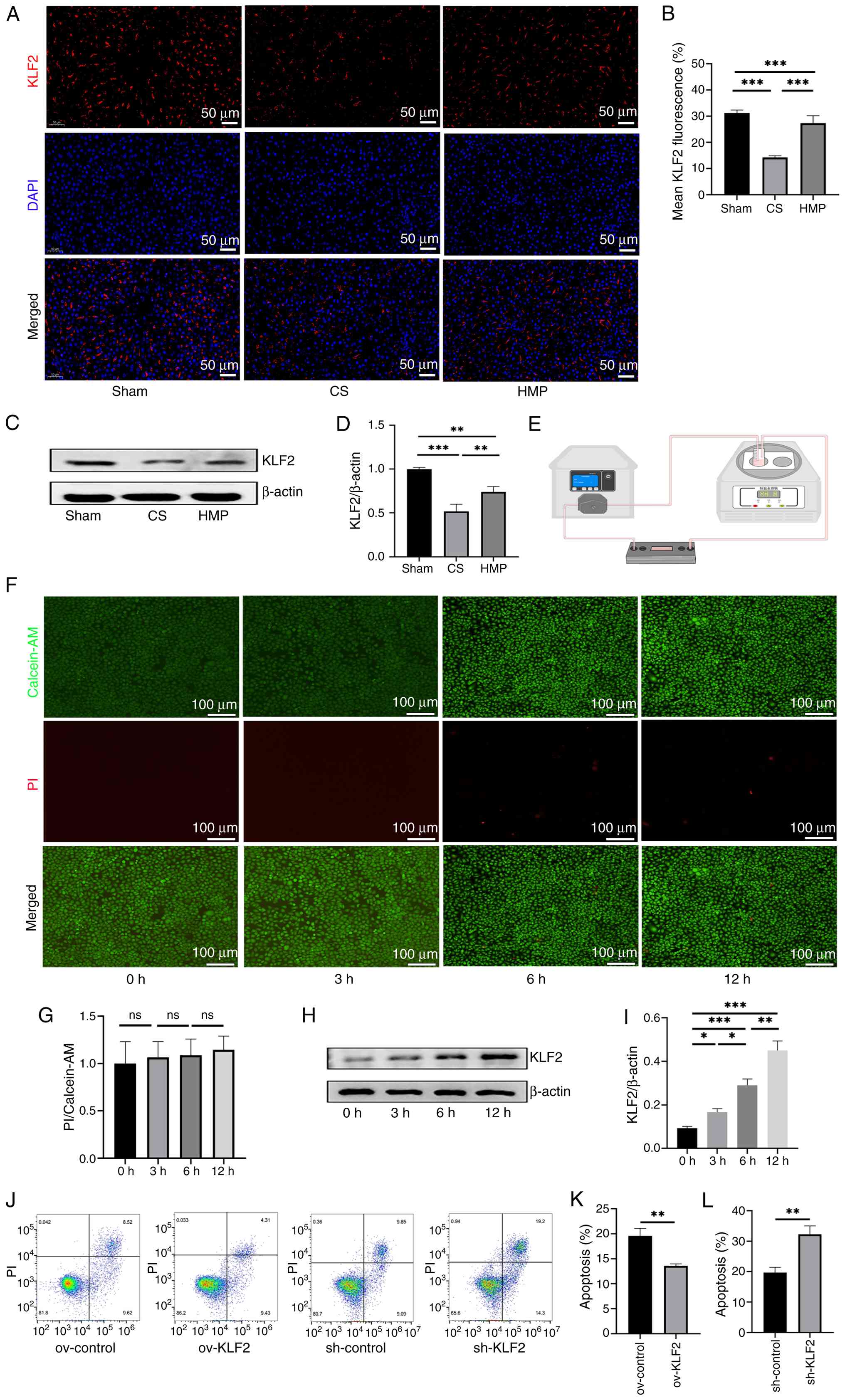 A parallel plate flow chamber system was used to simulate in vivo shear stress conditions in vitro (Fig. 4E) to validate that KLF2 expression is specifically induced by ECs under laminar flow conditions. Calcein-AM/PI staining was performed at 0, 3, 6 and 12 h, showing no significant differences in EC damage caused by shear stress at these time points (Fig. 4F and G). Western blot analysis of cell samples revealed that KLF2 expression increased with duration of laminar flow (Fig. 4H and I). These findings suggested that HMP may protect DCD liver grafts through upregulation of KLF2. Additionally, the protective phenotype of EC KLF2 upregulation under CS/Rep conditions was verified. In vitro experiments using an EC CS/Rep model revealed that overexpression of KLF2 decreased apoptosis, whereas knockdown of KLF2 increased apoptosis (Fig. 4J-L). These results suggested that the protective effect of HMP on DCD livers was closely associated with the upregulation of KLF2.