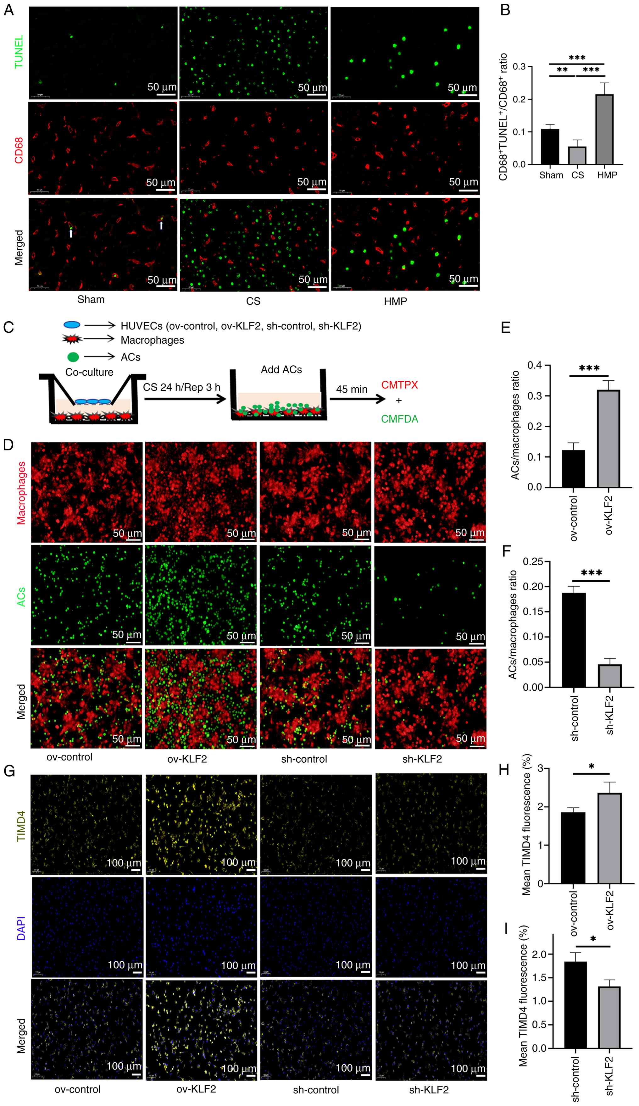 To confirm that KLF2 upregulation in ECs promoted macrophage efferocytosis, PMA-induced THP-1-derived macrophages were co-cultured with HUVECs expressing different levels of KLF2 (Fig. 5C). Under the Transwell non-contact co-culture condition, both cell types were placed in a cold IR model to simulate their interaction during cold IR. ACs were co-incubated with macrophages. The present study assessed macrophage efferocytosis in vitro by quantifying the co-positive expression of CMTPX (red tracer for macrophages) and CMFDA (green tracer for ACs). Macrophages co-incubated with ov-KLF2-expressing HUVECs showed significantly higher efferocytosis compared with the ov-control group (Fig. 5D-F). However, compared with the sh-control group, the sh-KLF2 group decreased efferocytosis. TIMD4, a marker of macrophage efferocytosis ability, expression was detected. Comparison of TIMD4 fluorescence intensity among these groups confirmed these findings (Fig. 5G-I). Specifically, macrophages in the ov-KLF2 group showed higher TIMD4 intensity than those in the ov-control group; compared with the sh-control group, the TIMD4 fluorescence intensity of macrophages in the sh-KLF2 group was significantly lower. These results indicated that the positive effect of HMP on DCD livers was mediated by upregulation of KLF2 expression to promote efferocytosis.