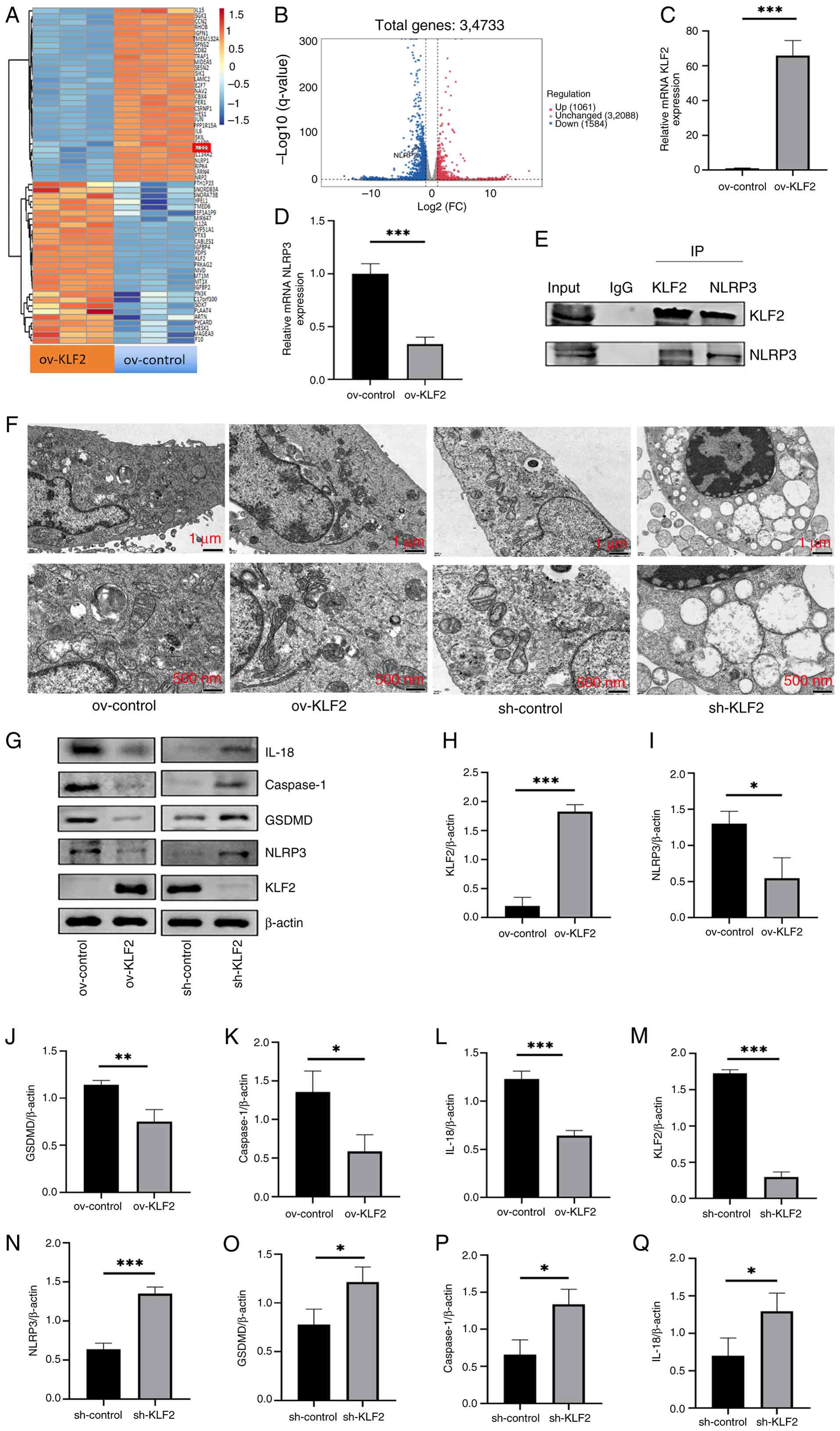 It is known that the inflammatory microenvironment of macrophages influences their phenotypical characteristics and phagocytic function (40). The present differential gene analysis focused on the expression of NLRP3 (Fig. 7B) as NLRP3-mediated pyroptosis amplifies the inflammatory response (41). In addition to NLRP3, RNA-seq revealed significant changes in the expression of other genes associated with inflammation. Specifically, levels of pro-inflammatory factors such as IL-6 and JUN were significantly downregulated.. NLRP3 expression levels were significantly lower in the ov-KLF2 compared with the ov-control group (Fig. 7C and D). To investigate the potential interaction between KLF2 and NLRP3, Co-IP was performed. There was a specific physical interaction between KLF2 and NLRP3, as evidenced by the presence of NLRP3 in the KLF2 immunoprecipitate and KLF2 in the NLRP3 immunoprecipitate (Fig. 7E). TEM was performed to observe signs of pyroptosis following CS/Rep treatment. Compared with the ov-control group, the ov-KLF2 group maintained relatively intact cell membranes. By contrast with the sh-control group, the sh-KLF2 group exhibited notable mitochondrial swelling with loss of most cristae, characteristic of pyroptosis (Fig. 7F). Western blot analysis of pyroptosis-associated molecules such as GSDMD, Caspase-1 and IL-18 (42-46) was performed. Overexpression of KLF2 significantly decreased the expression of NLRP3 and pyroptosis-related proteins, while the sh-KLF2 group showed the opposite trend (Fig. 7G-Q). Compared with the sh-KLF2 group, the sh-KLF2 + MCC950 group showed a significant inhibition in the expression of key pyroptosis-related proteins (Fig. S3A-E). These results collectively indicated that KLF2 upregulation suppressed the NLRP3-mediated pyroptosis pathway in ECs during CS/Rep. NLRP3 inhibitor under KLF2-deficient conditions effectively rescued the exacerbated pyroptotic phenotype.