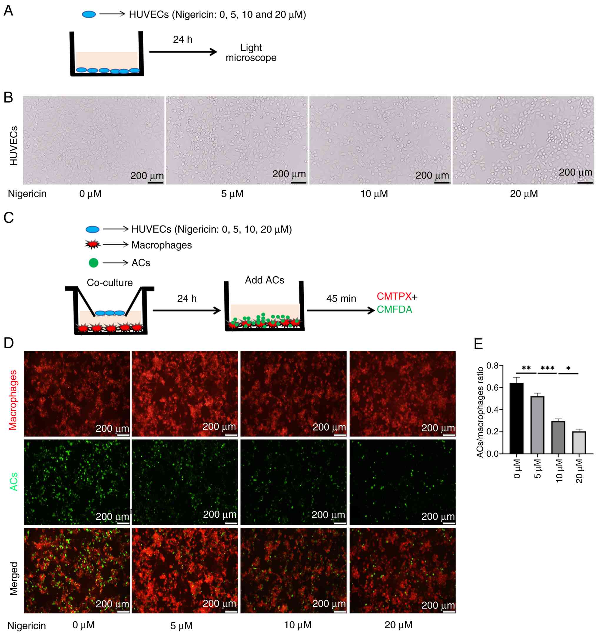 To explore the impact of EC pyroptosis on macrophage efferocytosis, pyroptosis of ECs was altered using the pyroptosis agonist nigericin (Fig. 8A). As the dose of nigericin increased, HUVECs exhibited distinct morphological changes. The cells shrank or swelled, the outlines became blurred, the cytoplasm appeared sparse or expanded and structure became irregular (Fig. 8B). To assess how EC pyroptosis affect macrophages efferocytosis, ECs were co-cultured with macrophages for 24 h in a non-contact setting (Fig. 8C). Macrophages were co-incubated with ACs for 45 min. The efferocytosis capacity of macrophages was quantified based on the co-localization of the tracers of the two cell types. When the degree of EC pyroptosis increased, macrophages co-cultured with these cells demonstrated a decreased ability to phagocytose apoptotic cells (Fig. 8D and E). Therefore, increased pyroptosis of ECs impaired macrophage efferocytosis.