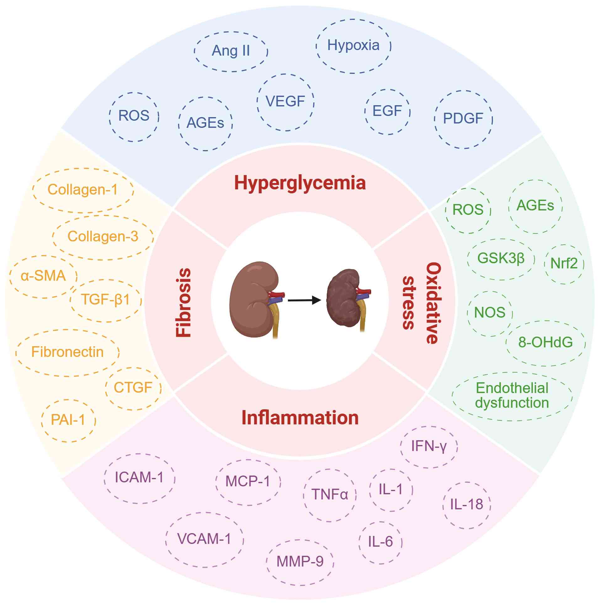 Diabetic kidney disease (DKD), a prevalent form of secondary nephropathy affecting 30-40% of the global diabetic population, is clinically characterized by persistent microalbuminuria accompanied by progressive deterioration of glomerular filtration function (1,2). The pathophysiological alterations of DKD primarily manifest as excessive extracellular matrix (ECM) accumulation, sustained activation of the inflammatory microenvironment, redox imbalance-mediated oxidative stress and mitochondrial dysfunction (3) (Fig. 1). Hyperglycemia-induced metabolic derangements trigger aberrant regulation of key signaling cascades, such as the AMP-activated protein kinase (AMPK), PI3K/Akt and MAPK pathways, which collectively orchestrate the molecular mechanisms driving disease onset and progression (4).