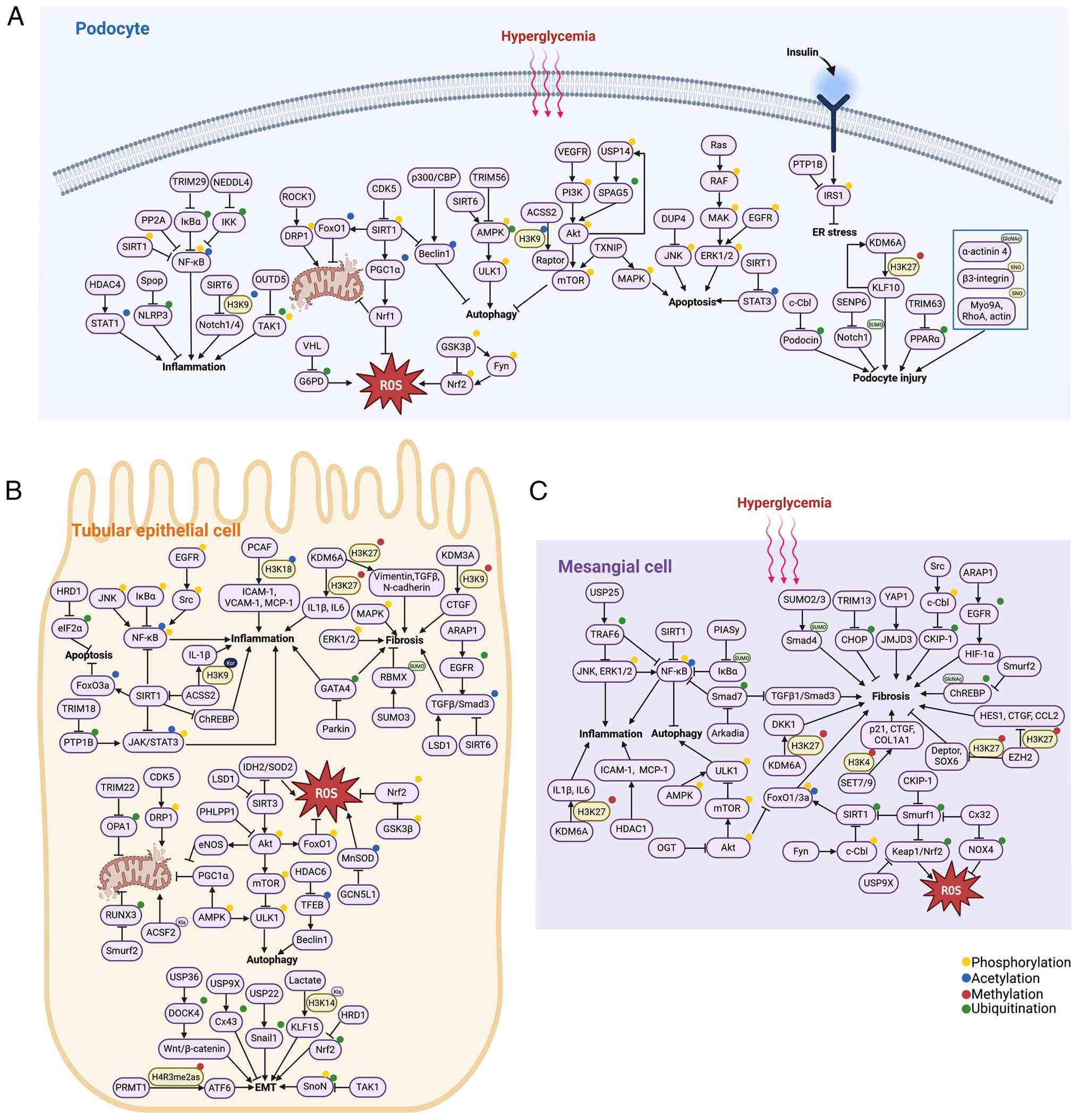 In summary, PTMs are key regulators that precisely modulate protein function, stability, interactions and subcellular localization. Their pervasive involvement in biological processes provides insights into the pathogenesis of DKD. The evolving research on PTM-regulatory agents, including novel compounds and ongoing clinical trials, underscores their therapeutic promise. However, current evidence for specific PTMs in DKD relies on cross-sectional studies from preclinical models, with a notable absence of systematic longitudinal research tracing the dynamic PTM alterations throughout the course of DKD onset and progression. Moreover, the intricate crosstalk among different PTM pathways remains poorly elucidated.