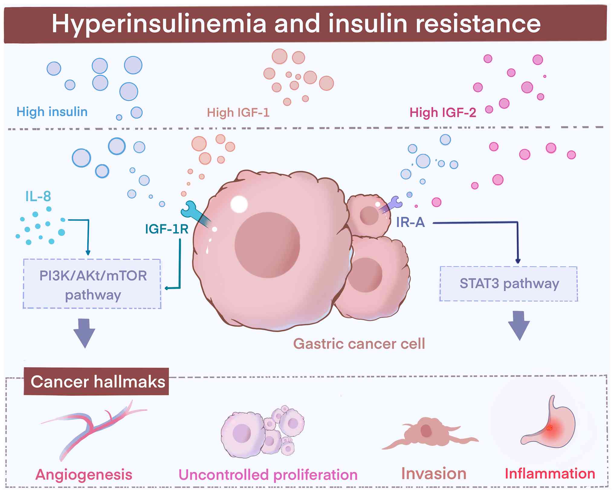 Additionally, elevated serum IGF-1 levels, combined with H. pylori infection, may increase GC risk, H. pylori-induced PI3K/Akt/mTOR signaling regulates glycolysis and protein synthesis, supporting cellular growth and metabolism (52). Both H. pylori and IGF-1 activate the PI3K/Akt-mTOR pathway (49). The insulin pathway interacts with two tyrosine kinase receptors activated by insulin, IGF-1 and IGF-2 (18).
