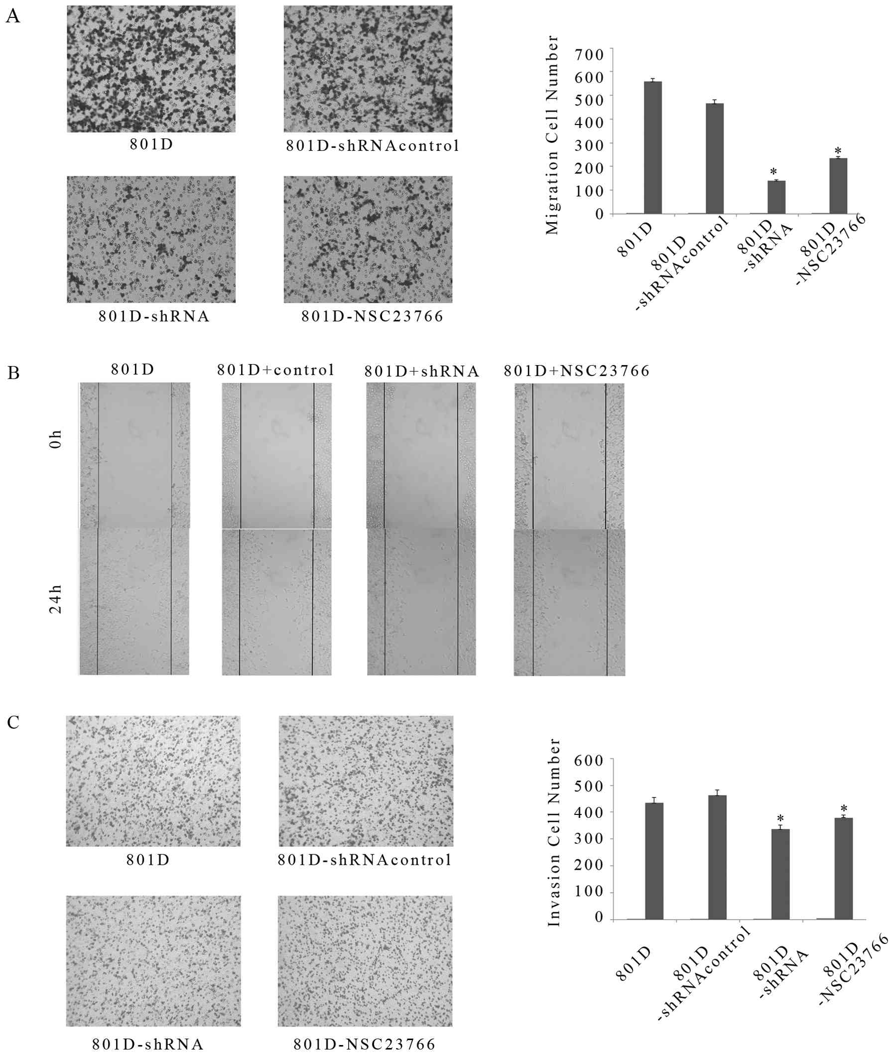 Upon contacting the authors about these issues, they realized that certain of the data had inadvertently been included in Figs. 1 and 3 incorrectly. The revised versions of Figs. 1 and 3, now featuring the correct data for weak cytoplasmic expression in Fig. 1E and the correct data panels for the 801D-shRNA control and 801D-NSC23766 experiments in Fig. 3A and C respectively, are shown opposite and on the next page. The authors wish to emphasize that the errors made in assembling the data in this pair of figures did not affect the overall conclusions reported in the paper. The authors are grateful to the Editor of International Journal of Molecular Medicine for granting them this opportunity to publish a Corrigendum, and apologize to both the Editor and the readership for any inconvenience caused.