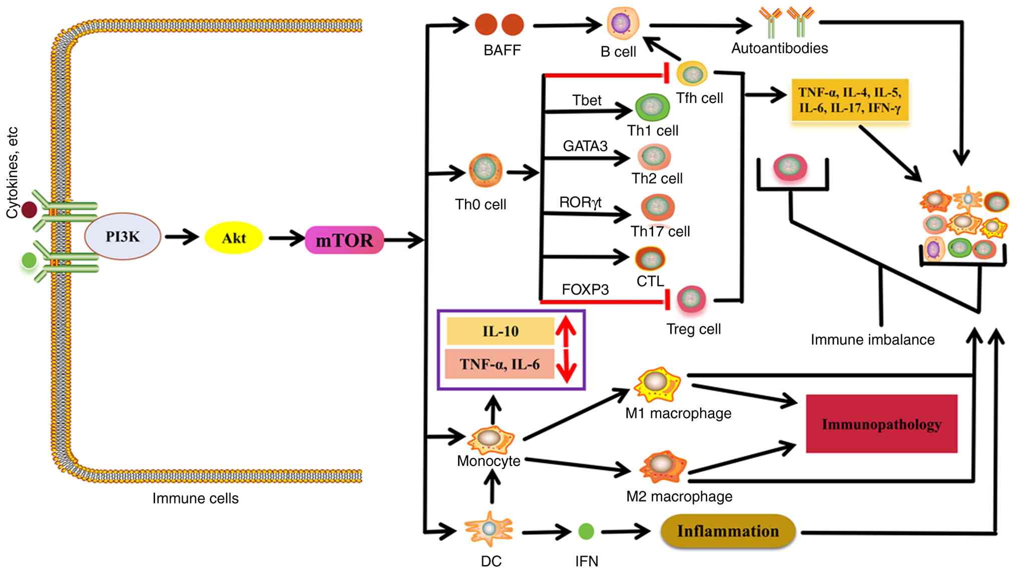 The mTOR signaling pathway serves a pivotal role in regulating the activation, proliferation and differentiation of immune cells, thereby influencing their functional properties. Dysregulation of this pathway can lead to immune imbalance (32-66) (Fig. 2). Due to its critical role in immune cell development and function, mTOR signaling has garnered increasing research attention.