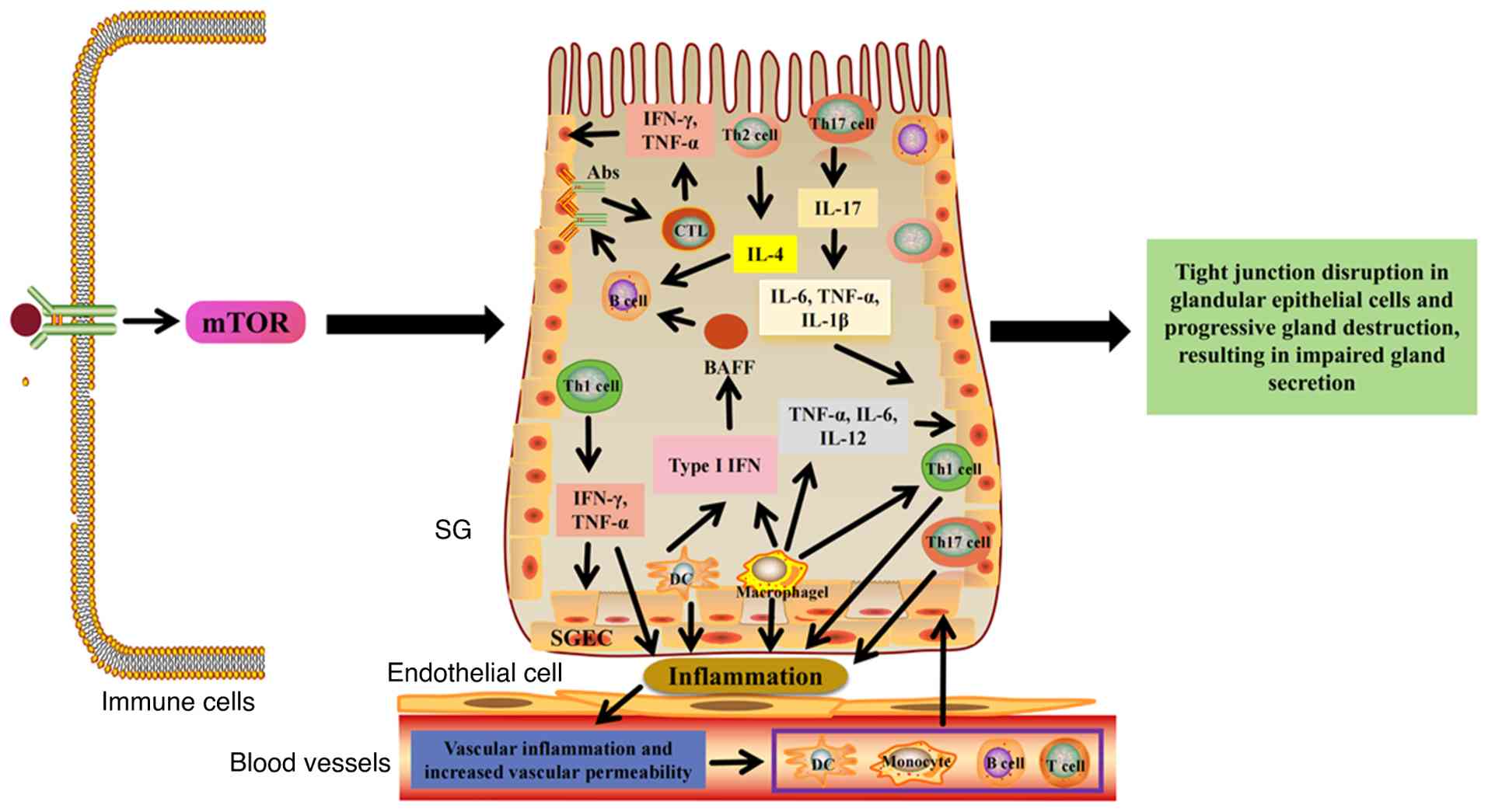 As aforementioned, activation of the mTORC signaling pathway also induces the proliferation and differentiation of CD4+ T cells into Th1 and Th2 subsets. The immune response in the SG of patients with pSS is predominantly mediated by Th1 cells, and Th1-associated cytokines such as IFN-γ and TNF-α are significantly elevated in SG tissue (87,88). These cytokines disrupt the integrity of tight junctions in SG epithelial cells and decrease the number of vesicle cells, thereby impairing glandular secretory function (88,89). Th2 cells contribute to B cell activation through cytokines such as IL-4 (90). The mTORC signaling pathway also activates macrophages, monocytes and DCs, which produce large quantities of type I IFN and IFN-γ, amplifying the inflammatory response and inducing elevated expression of BAFF. Elevated BAFF levels are observed in the SG of patients with pSS (91). The interaction between BAFF and its receptor promotes B cell activation, maturation and proliferation, leading to aberrant antibody production, including anti-Sjögren's-syndrome-related antigen (SS)A and anti-SSB autoantibodies. These autoantibodies bind glandular epithelial cells and transmit activating signals to T cells, driving their differentiation into CD8+ cytotoxic T lymphocytes (CTLs) (88). CTLs accumulate within the SG, where they secrete high levels of IFN-γ and TNF-α, sustaining glandular inflammation and contributing to the pathogenesis of pSS (88). Additionally, type I IFN stimulates macrophages to produce the chemokine C-X-C motif ligand 13 (CXCL13), which promotes B cell aggregation within the SG, thereby intensifying the inflammatory response (92). In this proinflammatory milieu, the mTOR signaling pathway activates macrophages to polarize toward the M1 phenotype, leading to the release of proinflammatory cytokines such as TNF-α, IL-6 and IL-12 (93,94). These cytokines accelerate extracellular matrix degradation and cell apoptosis, promote T cell differentiation into Th1 cells and exacerbate glandular inflammation, resulting in tissue destruction (93,94). As pSS progresses, this chronic inflammation gradually subsides, and M1 macrophages polarize toward the M2 phenotype under the influence of TGF-β1 signaling (88,95). M2 macrophages secrete anti-inflammatory mediators, including IL-10 and TGF-β, which further reinforce M2 polarization and signaling, thereby promoting glandular fibrosis (88,95). Under this sustained inflammatory state, vascular endothelial cells in the SG become damaged. Intercellular adhesion molecule-1 facilitates the adhesion of immune cells to endothelial surfaces, promoting endothelial cell activation. Consequently, vascular inflammatory responses increase vascular permeability, creating a favorable environment for the migration of immune cells, such as DCs, macrophages and lymphocytes, from the periphery into the SG, thereby enhancing immune cell infiltration (75,96,97). Therefore, in pSS, activation of the mTOR signaling pathway primarily influences immune cell proliferation and differentiation, contributes to immune imbalance, such as Th17/Treg disequilibrium and M1/M2 polarization imbalance, promotes the production of inflammatory cytokines and chemokines and facilitates immune cell infiltration into the SG. The resulting inflammatory response disrupts the tight junctions of glandular epithelial cells, progressively destroying glandular architecture via atrophy, ductal dilation and narrowing, leading to glandular damage and secretory dysfunction (Fig. 3).