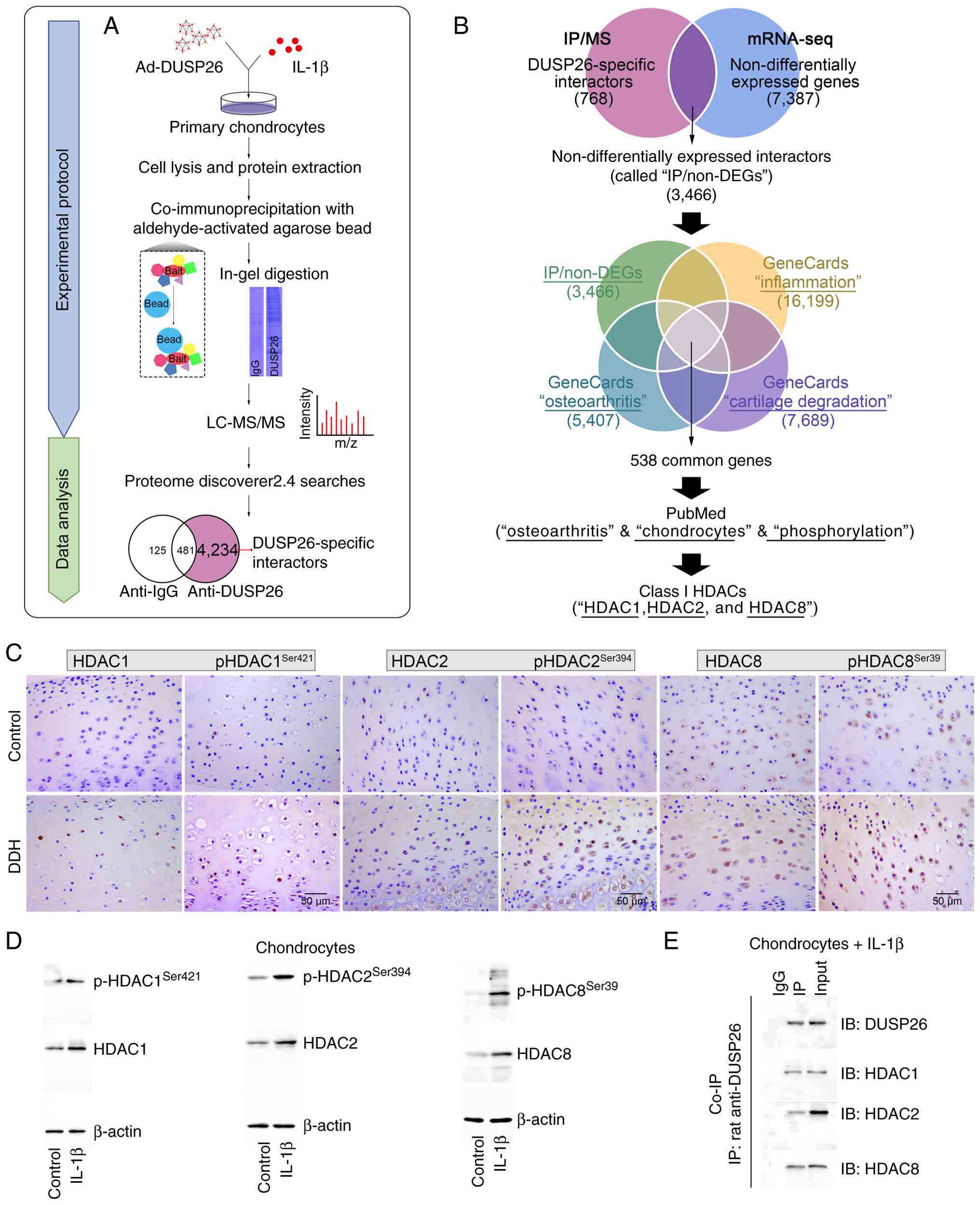 DUSP26-specific interactors were identified by IP/MS analysis. Non-differentially expressed genes were selected from mRNA-seq data using the following screening criteria: −1<log2FC<1 and P≥0.05. GeneCards (https://www.genecards.org/) was used to retrieve genes associated with 'osteoarthritis', 'cartilage degradation' and 'inflammation'. The jvenn online tool (https://jvenn.toulouse.inrae.fr/app/index.html) was employed to visualize the intersection of gene sets using Venn diagrams. Finally, candidate genes related to 'osteoarthritis', 'chondrocytes' and 'phosphorylation' were identified through PubMed literature search engines (https://pubmed.ncbi.nlm.nih.gov/).