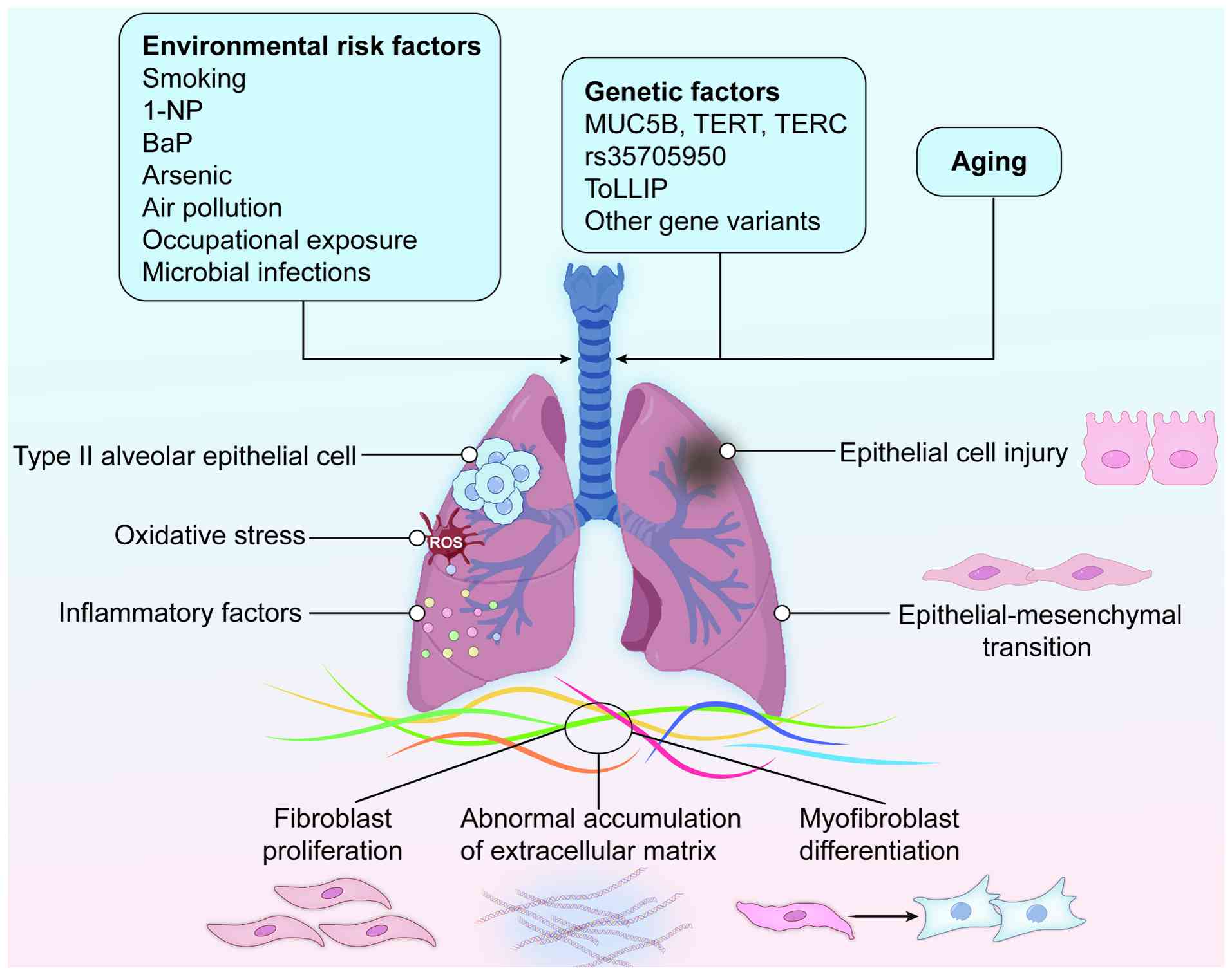 In summary, the pathogenesis of PF is not caused by a single factor but results from the combined effects of genetic predisposition, aging and various environmental exposures (including air pollutants, smoking and microbial infections). These factors lay the foundation or provide the initial 'hit' for sustained alveolar epithelial injury and abnormal repair, disrupting pulmonary homeostasis and thereby initiating a complex pathophysiological process. The core features of this process include abnormal cellular behavior and molecular signaling activation under the interaction of genetic and environmental factors, ultimately leading to irreversible fibrosis.