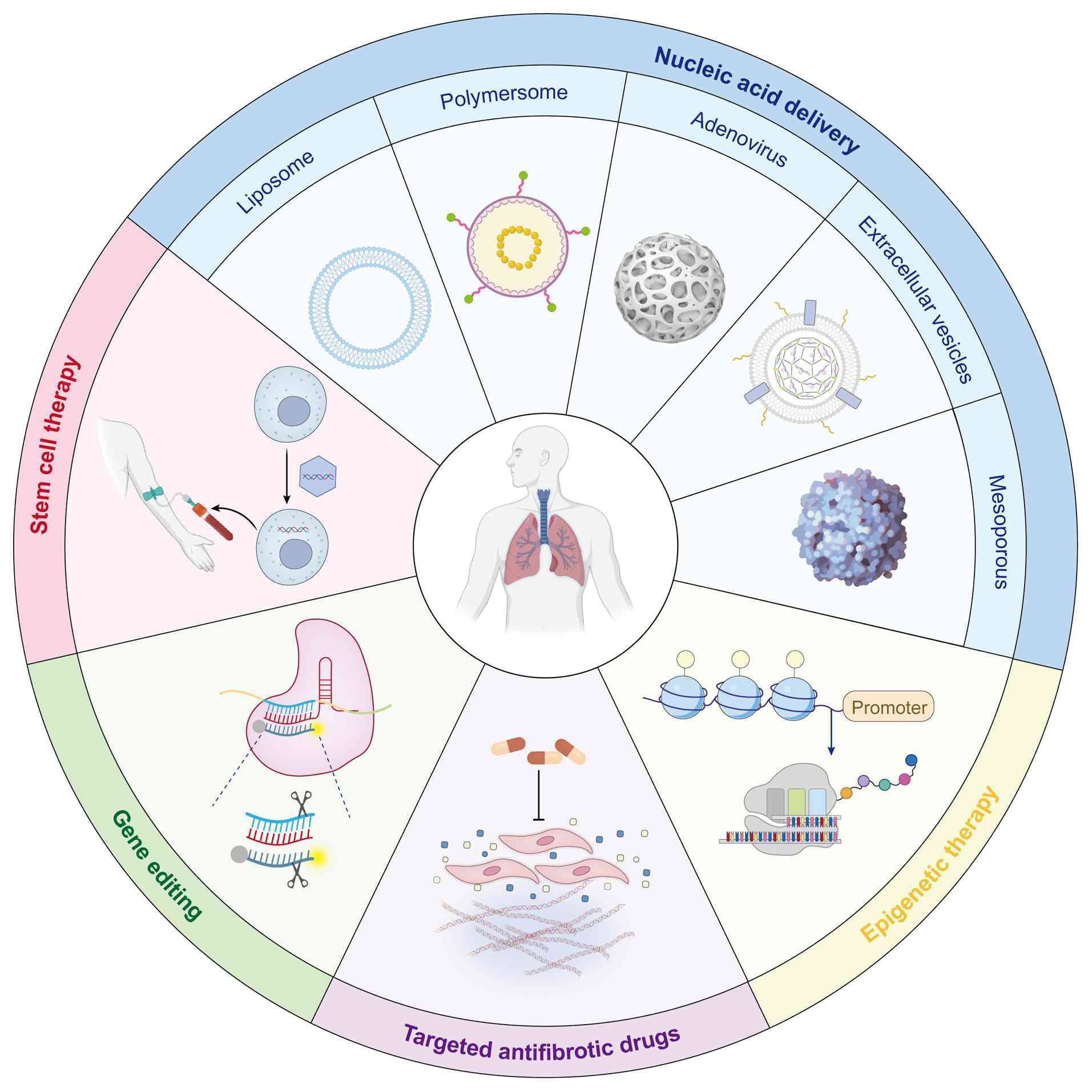 Epigenetic therapy offers a novel treatment approach by regulating gene expression and repairing epigenetic changes caused by genetic damage or environmental factors. While the development of epigenetic drugs is still in its early stages, their potential to intervene in the fibrotic process and restore normal gene function should not be underestimated. Nucleic acid delivery technologies, utilizing small RNA molecules and gene editing techniques, enable direct regulation of gene expression and the repair of disease-causing genes, providing a more precise and personalized treatment option for PF. Despite challenges such as efficient delivery, targeting and side effects, advancements in delivery technology hold the promise of breakthroughs in this field. The application of AI in PF treatment has also become an emerging research focus. AI can leverage big data analysis, machine learning and other technologies to precisely screen drugs, predict disease progression and optimize individualized treatment plans, markedly enhancing treatment efficiency. Nevertheless, the future of PF treatment remains fraught with challenges, particularly in effectively integrating these advanced technologies into clinical practice.