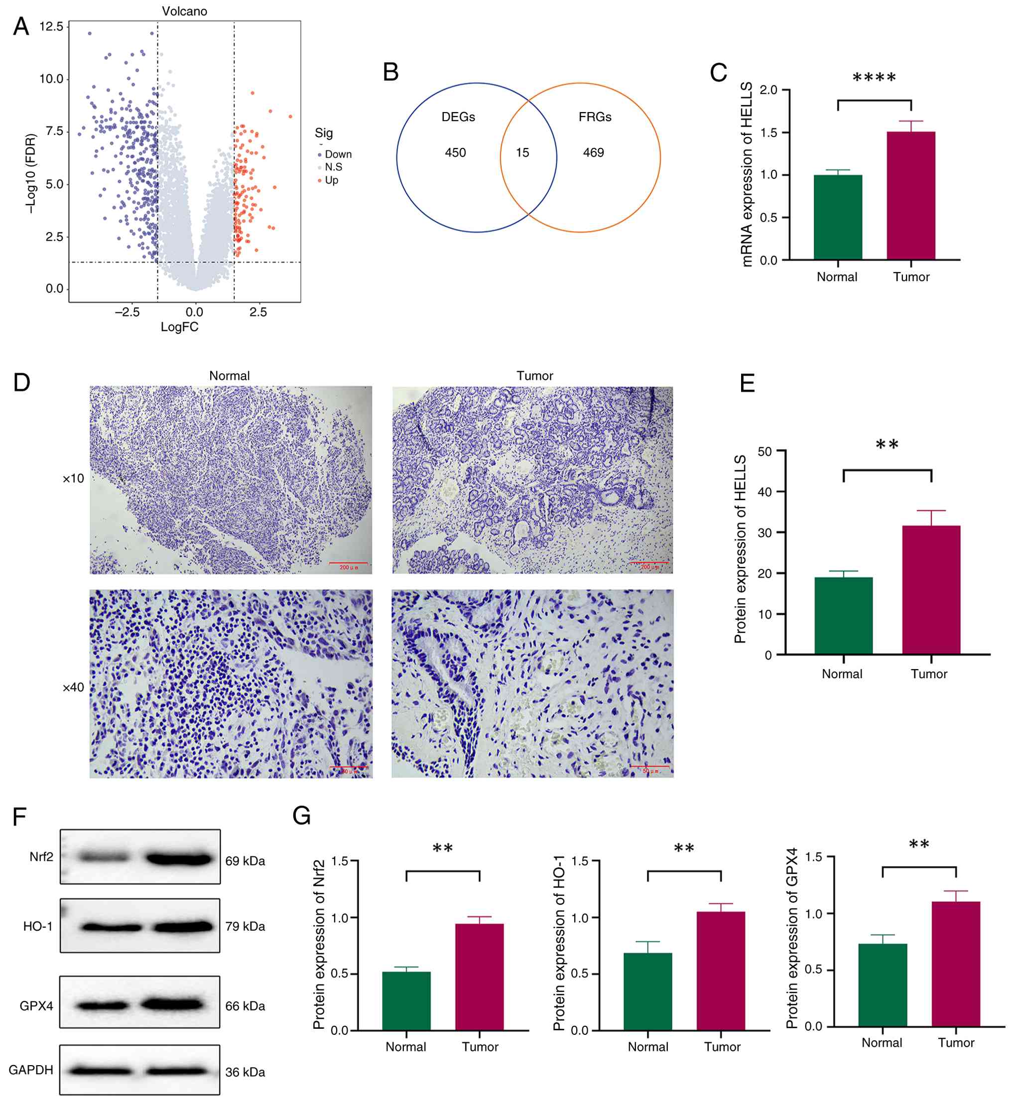 A total of 465 DEGs, comprising 125 upregulated and 331 downregulated genes, were identified from the GSE12452 dataset (Fig. 1A). Additionally, a total of 484 FRGs were obtained from FerrDB (Table SII), and 15 DEGs associated with ferroptosis (FRDEGs) were obtained by the intersection between DEGs and FRGs (Fig. 1B and Table SIII). In the present study, HELLS was ultimately chosen from 15 FRDEGs for further investigation based on a thorough literature review (28-32) and alignment with research interests.