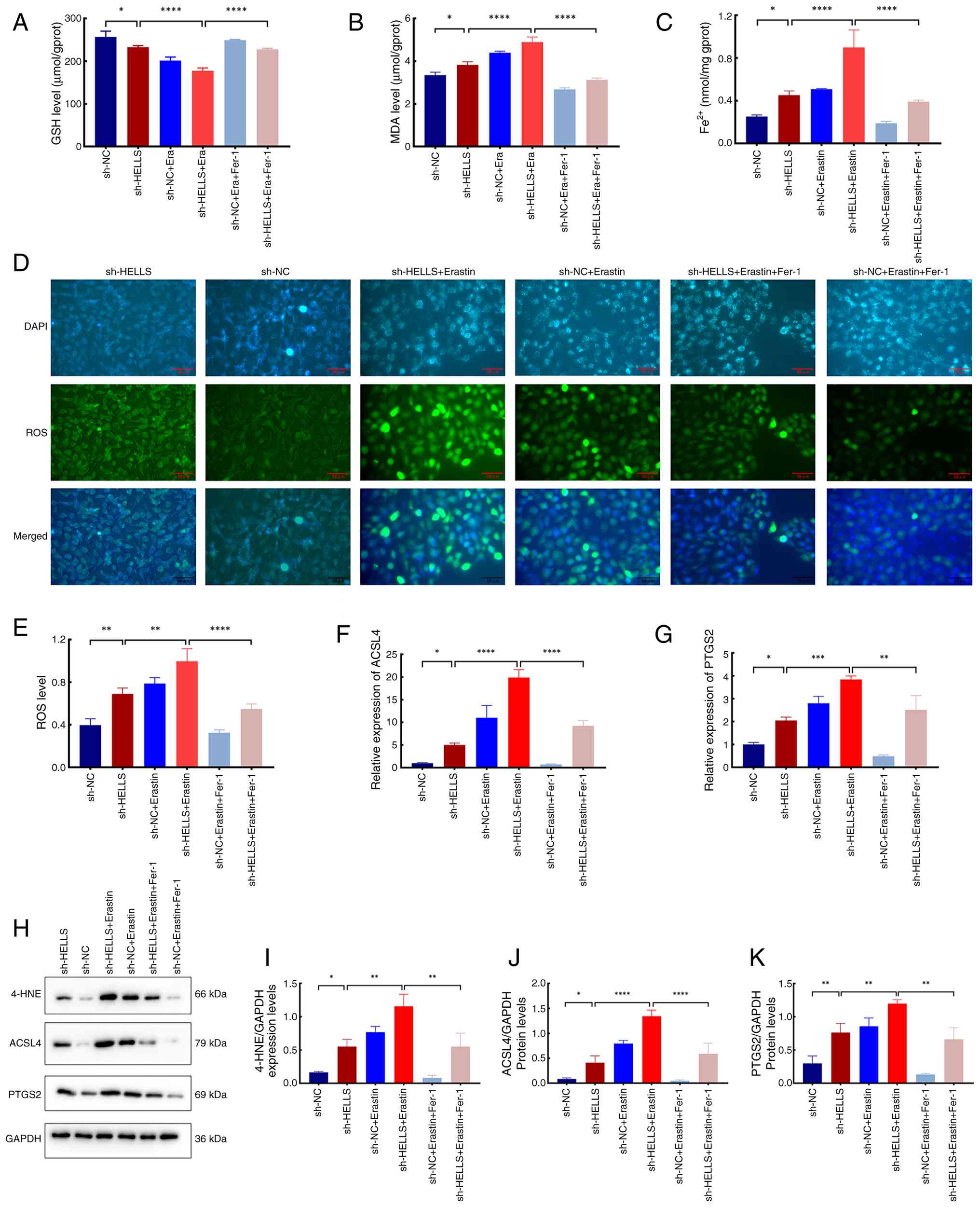 4-Hydroxynonenal (4-HNE) functions as a significant biomarker for ferroptosis-associated lipid peroxidation. Western blot analysis showed that 4-HNE levels accumulated in patterns consistent with the expression profiles of ACSL4 and PTGS2 across all cell groups (Fig. 3H and I; P<0.05), further supporting that HELLS significantly suppresses ferroptosis.
