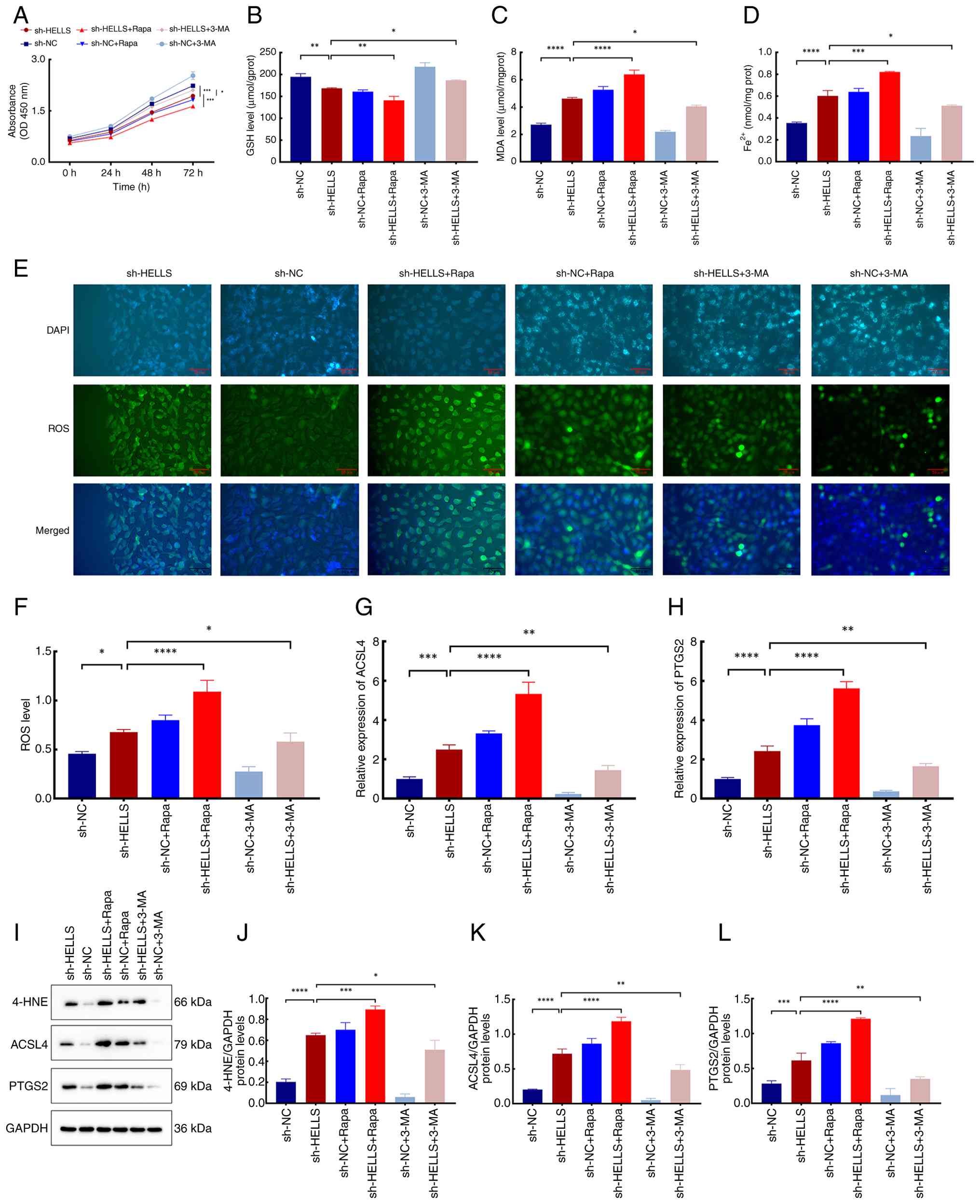Moreover, expression levels of ACSL4 and PTGS2 were increased in the sh-HELLS group compared with those in the sh-NC group (P<0.05). Similarly, Rapa or 3-MA treatment resulted in the upregulation or downregulation of these genes, respectively (Fig. 4G and H; P<0.05). The expression patterns of the corresponding proteins aligned with those of their respective genes, as well as the consistent expression level of the biomarker 4-HNE (Fig. 4I-L; P<0.001 and P<0.0001). Undoubtedly, these findings provide compelling evidence that HELLS is crucial in inhibiting autophagy-dependent ferroptosis.