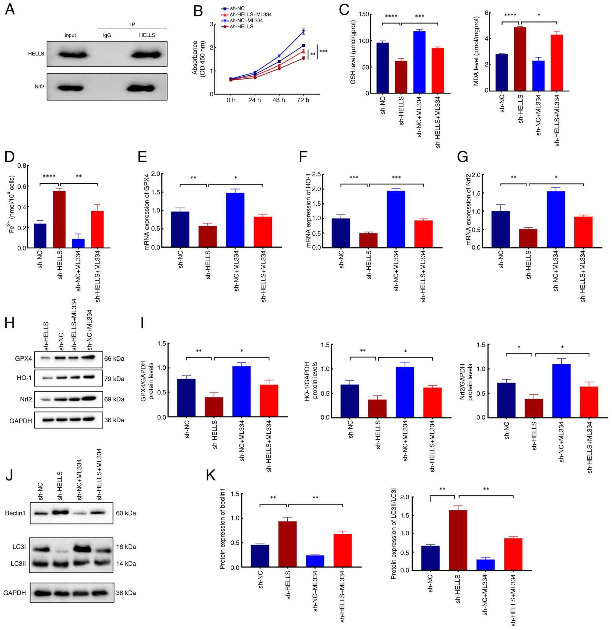 The Co-IP results indicated that there was an interaction between HELLs and Nrf2 (Fig. 5A). Cell viability assessment revealed that the sh-HELLS group had significantly lower cell viability than the sh-NC group (P<0.05). Nevertheless, following ML334 treatment, cell viability significantly enhanced, indicating that ML334 effectively mitigates the ferroptosis induced by HELLS knockout (Fig. 5B; P<0.05). Additionally, the levels of ferroptosis biomarkers (GSH, MDA and Fe2+) were re-evaluated following ML334 treatment. Consistent with previous investigations, GSH levels significantly decreased after HELLS knockout, whereas MDA and Fe2+ levels comparatively increased (P<0.0001). Following ML334 treatment, GSH levels significantly increased, accompanied by a simultaneous decrease in MDA and Fe2+ concentrations in both cell groups, in comparison with pretreatment conditions (Fig. 5C and D; P<0.05).