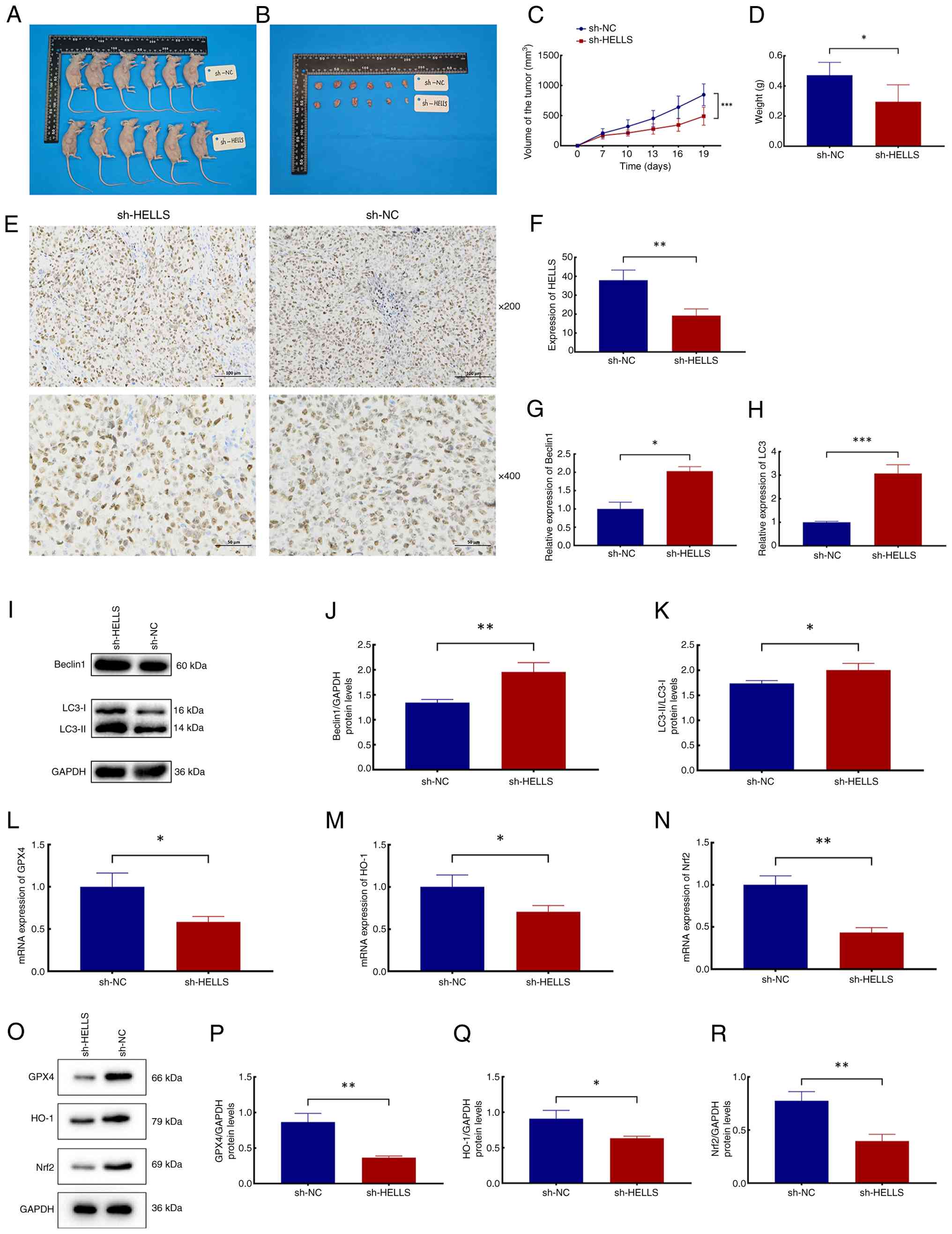 In vitro studies have demonstrated that HELLS inhibits ferroptosis by modulating the Nrf2/HO-1/GPX4 signaling pathway, thereby facilitating NPC progression. To further validate this, in vivo investigations were also conducted. Initially, a tumorigenesis assay utilizing nude mice was conducted to establish a xenograft model of NPC (Fig. 6A and B). The data presented (Fig. 6C and D) clearly indicated that the tumor volume and weight in the sh-HELLS group were substantially reduced in comparison with those in the sh-NC group (P<0.05), further indicating that HELLS acts as a critical factor in promoting NPC development. Moreover, the expression level of HELLS was significantly reduced in the tumor tissue in the sh-HELLS group in comparison with that in the sh-NC group (Fig. 6E and F; P<0.01). Besides, mRNA and protein expression levels of the autophagy markers LC3 and Beclin 1 were significantly upregulated in tumors with suppressed HELLS expression, indicating a suppressive effect of HELLS on autophagy (Fig. 6G-K; P<0.05 and P<0.001).