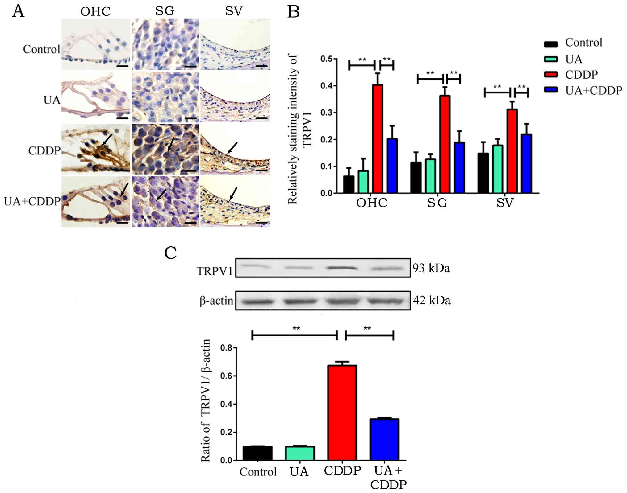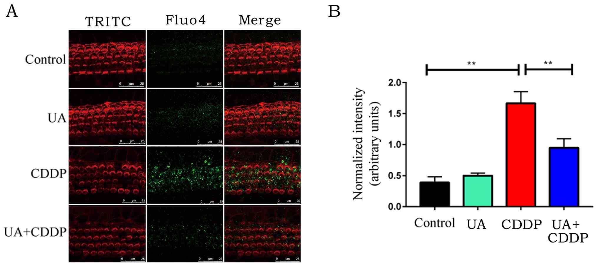 Following the publication of this paper, it was drawn to the Editor's attention by an interested reader that, regarding the immunohistochemical images in Fig. 2A on p 809, the Control/SG and UA/SG data panels contained an overlapping data section, suggesting that these data panels had been derived from the same original source. In addition, concerning the outer hair cell images shown in Fig. 4A on p. 811, the CDDP/TRITC and UA+CDDP/TRITC data panels appeared to be matching, suggesting that this figure had also been assembled incorrectly.