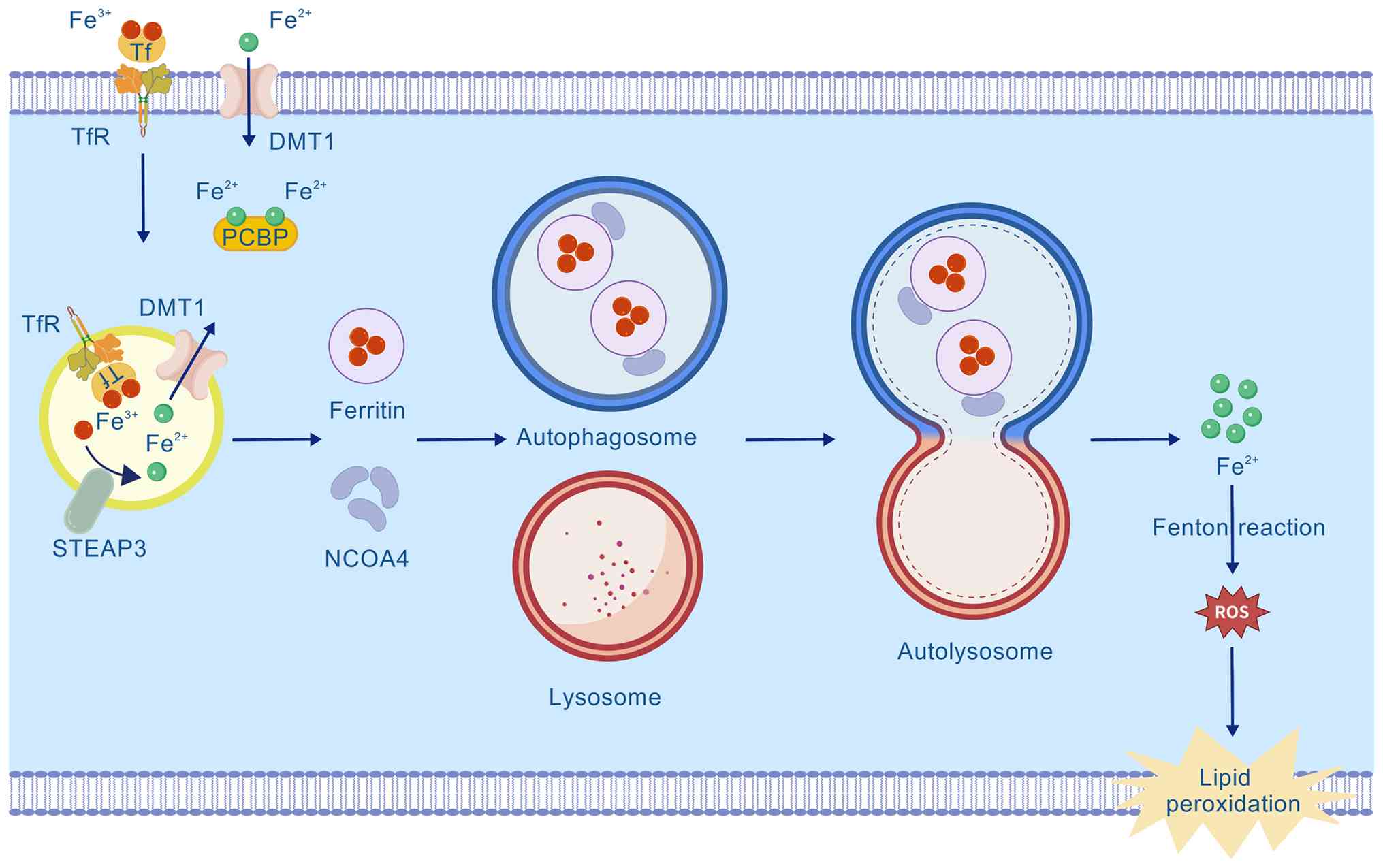 Ferritin is a highly conserved iron-containing storage protein ubiquitously distributed in living organisms. Its unique three-dimensional structure composed of a protein shell and an inorganic mineral core enables it to oxidize and store iron. The protein shell forms a hollow cavity assembled from two functionally distinct subunits: The ferritin heavy chain (FTH) with ferroxidase activity and the ferritin light chain (FTL), which facilitates iron mineralization. The mineral core sequesters up to 4,000 ferric iron (Fe3+) ions. Ferritin, the primary iron storage protein in biological systems, stores iron predominantly in the iron oxyhydroxide form, potentially incorporating phosphorus-containing components (4). However, the precise mineral structure of this core remains unclear. The iron sequestration mechanism relies on the ferroxidase activity of FTH and the specialized chemical microenvironment within the cavity, which collectively promotes iron ion recruitment and mineralization. Importantly, excess free iron that is not properly incorporated into the ferritin core may induce oxidative stress (OS) by catalyzing ROS generation, leading to cellular damage (5). Ferritinophagy, a selective autophagy process mediated by NCOA4, plays a pivotal role in the regulation of systemic iron homeostasis. Under conditions of iron overload, ferritinophagy is activated, leading to the release of stored Fe2+ from ferritin. This increase in the labile iron pool can exacerbate ROS production via the Fenton reaction and, when coupled with insufficient antioxidant capacity, may trigger ferroptosis. The interconnected pathway between ferritinophagy and ferroptosis has been implicated in the pathogenesis of diverse human diseases, including metabolic disorders, neurodegenerative diseases, malignancies and infectious conditions. In this context, as iron overload and OS represent common pathological hallmarks across multiple disease entities, Jin et al (6) postulated that ferritinophagy may exhibit a broader disease relevance through its dual regulatory effects on iron homeostasis and ROS dynamics, which directly intersect with ferroptotic pathways.