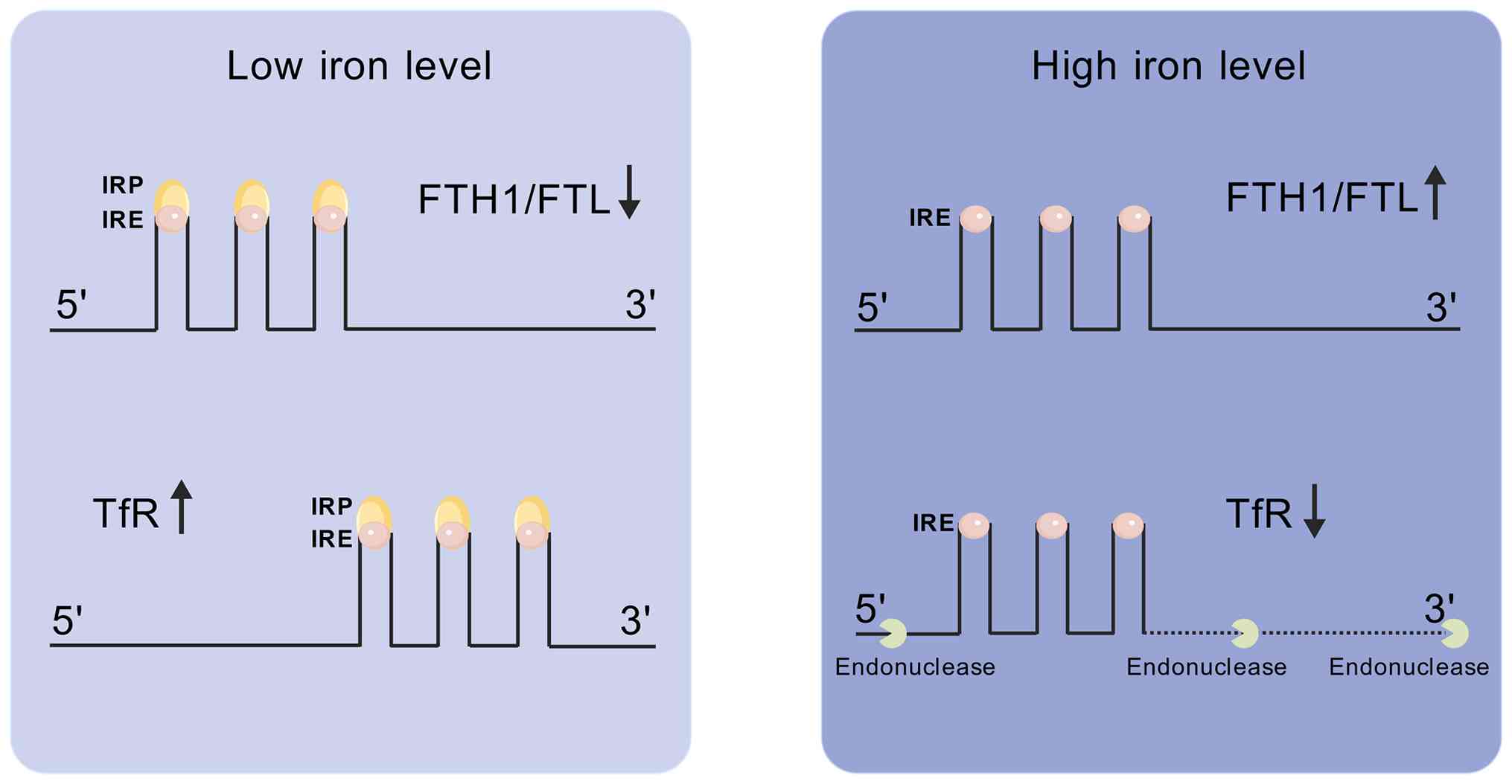 Precise regulation of brain iron homeostasis is crucial for neuronal survival, with ferritin occupying a central position in this network as the primary intracellular iron storage protein. Cellular iron metabolism begins with the binding of Tf-bound Fe3+ to the Tf receptor 1 (TfR1), which is followed by endocytosis (Fig. 1) (14,15). Within the endosome, Fe3+ is reduced to Fe2+ by the six-transmembrane epithelial antigen prostate 3 and then transported into the cytosol via DMT1. Cytosolic Fe2+ is chaperoned by proteins such as poly(rC)-RNA-binding protein (PCBP) and delivered to ferritin for storage in a biocompatible form, thereby effectively preventing the neurotoxicity of labile iron (Fig. 1) (16). Dynamic ferritin expression is key to cellular iron-buffering systems. This process is precisely controlled by the iron regulatory protein (IRP)/iron-responsive element (IRE) system (Fig. 2). IRPs bind to IREs located in the 5' or 3' untranslated regions of iron-related mRNAs, thereby regulating the expression of iron uptake (TfR1) and storage (FTH1/FTL) proteins. Under iron-deficient conditions, IRPs bind to IREs with high affinity, repressing ferritin mRNA translation and stabilizing TfR1 mRNA. Conversely, when iron is sufficient, IRP binding is reduced, promoting ferritin synthesis and facilitating endonucleolytic degradation of TfR1 mRNA (17). This IRP/IRE-mediated regulation operates on a relatively rapid timescale, enabling cells to swiftly adapt to fluctuations in iron availability. This rapid response is particularly crucial in acute brain iron challenges, such as hemorrhage, where it serves as an immediate defense against iron toxicity. Conversely, in chronic conditions like neurodegenerative diseases, persistent iron overload may overwhelm or dysregulate this adaptive system, contributing to long-term iron accumulation and neuronal vulnerability. This core regulatory network is further integrated with upstream stress-signaling pathways. For example, the transcription factor EB, a master regulator of the autophagy-lysosome system, confers dual protection against ferroptosis. It upregulates TfR1 and promotes its lysosomal membrane localization to facilitate clearance of the labile iron pool, and cooperatively enhances the synthesis of FTL and FTH via a TfR1-dependent pathway, thereby reinforcing safe iron storage (18). Similarly, activation of peroxisome proliferator-activated receptor δ modulates the expression of DMT1, FPN1 and ferritin by regulating IRP1, ultimately restoring iron homeostasis and preventing neurotoxicity (19). Collectively, these findings reveal that ferritin is a key effector molecule involved in multiple neuroprotective pathways. Supporting this notion, a study using AD models demonstrated that TfR1 knockdown restored iron homeostasis and ameliorated mitochondrial dysfunction, a process possibly involving ferritin, suggesting that TfR1 is a potential target for mitigating iron overload in AD by modulating this network (20). Finally, cellular iron balance relies on efflux. FPN1, the sole known cellular iron exporter, mediates iron efflux during iron overload. This process is negatively regulated by hepcidin through its interaction with FPN1 (Fig. 3), working in concert with the storage function of ferritin to maintain precise intracellular iron homeostasis.