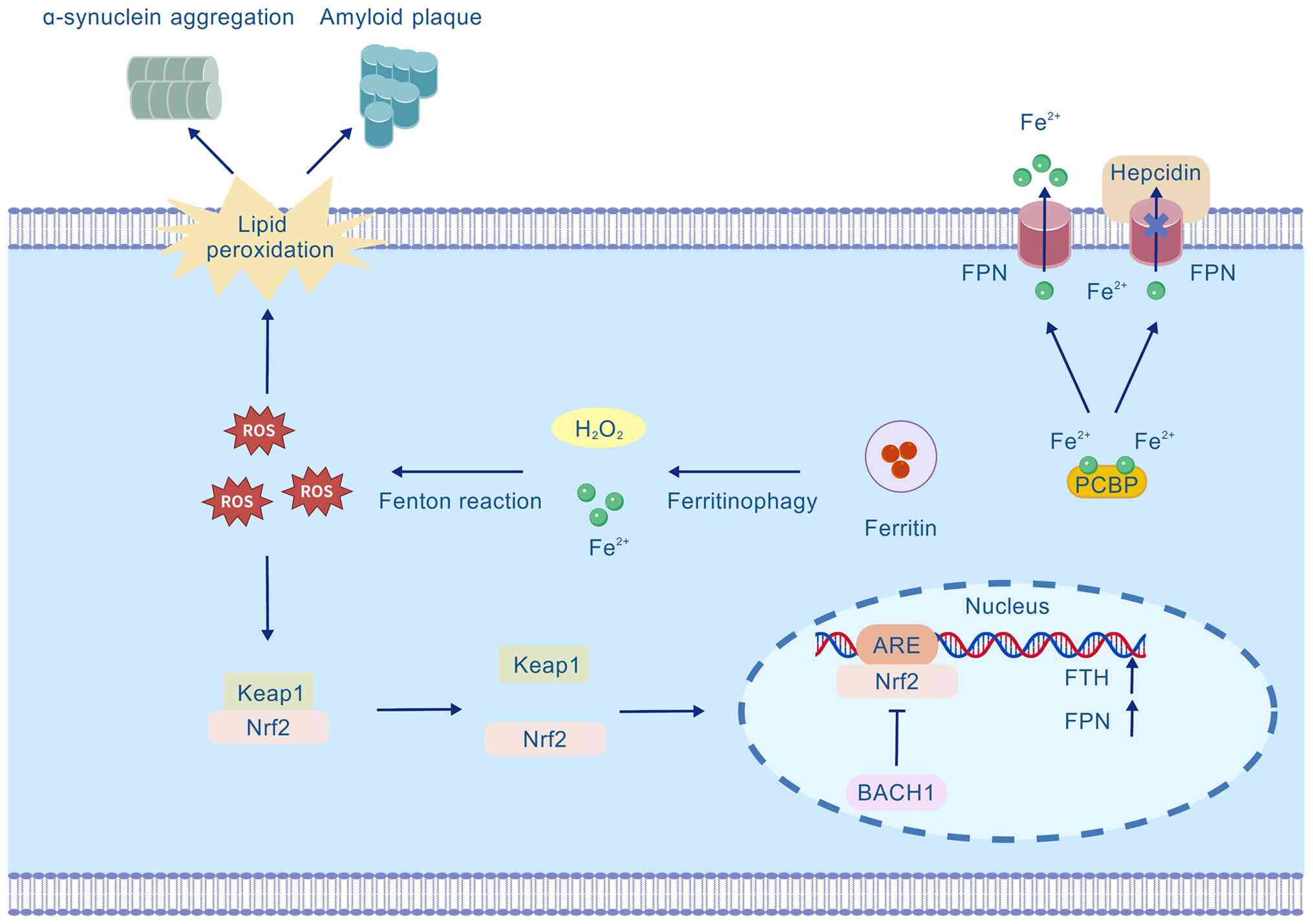 Iron is an essential element of life and plays a central role in biological processes (1). Iron is required for the proper functioning of numerous enzymes. However, free ferrous iron (Fe2+) exerts toxicity despite its biological importance. Dysregulation of intracellular iron homeostasis, a critical etiological factor in neurodegenerative diseases, triggers destructive effects via Fenton reaction-derived reactive oxygen species (ROS), ultimately leading to ferroptosis (2,3). Ferroptosis causes the oxidative destruction of the cell membrane through three key mechanisms: Dysregulation of the antioxidant system, disruption of iron metabolism and accelerated lipid peroxidation. To prevent detrimental effects, cellular systems tightly regulate iron levels through coordinated mechanisms, including the hepcidin-ferroportin (FPN) axis, the divalent metal transporter 1 (DMT1)-transferrin (Tf) system, and the ferritin-nuclear receptor coactivator 4 (NCOA4) pathway (1,2).