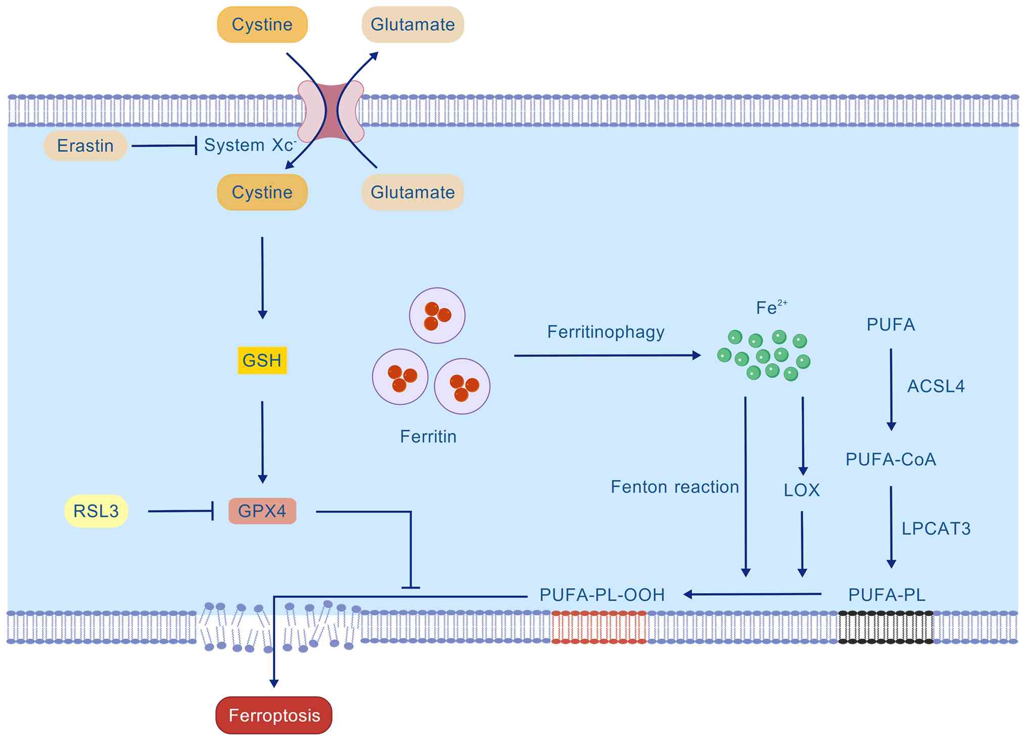 Oxidation of polyunsaturated fatty acids (PUFAs) containing bis-allylic hydrogen atoms, such as arachidonic acid and adrenic acid, is a hallmark of ferroptosis (Fig. 4). First, PUFAs must be activated and esterified into membrane phospholipids. This process is initiated by acyl-CoA synthetase long-chain family member 4 (ACSL4), which converts free PUFAs into their acyl-CoA esters (PUFA-CoAs), a prerequisite for their incorporation into membrane lipids (31). As the primary enzyme that loads PUFAs into phospholipids, ACSL4 determines the cellular abundance of PUFA-containing membrane lipids, thereby establishing the membrane's intrinsic sensitivity to lipid peroxidation and ferroptosis. Lysophosphatidylcholine acyltransferase 3 catalyzes the remodeling of PUFA-CoAs into membrane phospholipids, generating PUFA-containing phospholipids (PUFA-PLs) (32). Membrane-integrated PUFA-PLs serve as direct substrates for lipid peroxidation. Lipoxygenases (LOXs), particularly 15-LOX, are highly selective for PUFA-PLs, including arachidonoyl phospholipids, and oxidize them to phospholipid hydroperoxides (PL-OOH). By contrast, large quantities of ferrous iron released from ferritin via ferritinophagy can efficiently promote the oxidation of PUFA-PLs to PL-OOH by generating high levels of ROS through the Fenton reaction. GPX4 is the key enzyme that prevents ferroptosis by catalyzing the reduction of PL-OOH to their corresponding non-toxic PL-OH, using GSH as a cofactor. Once formed, if not promptly reduced by GPX4, PL-OOH reacts with adjacent PUFA-PLs, initiating a self-amplifying positive feedback cycle of lipid peroxidation. This uncontrolled chain reaction ultimately leads to irreversible disruption of membrane integrity and cell death (30).