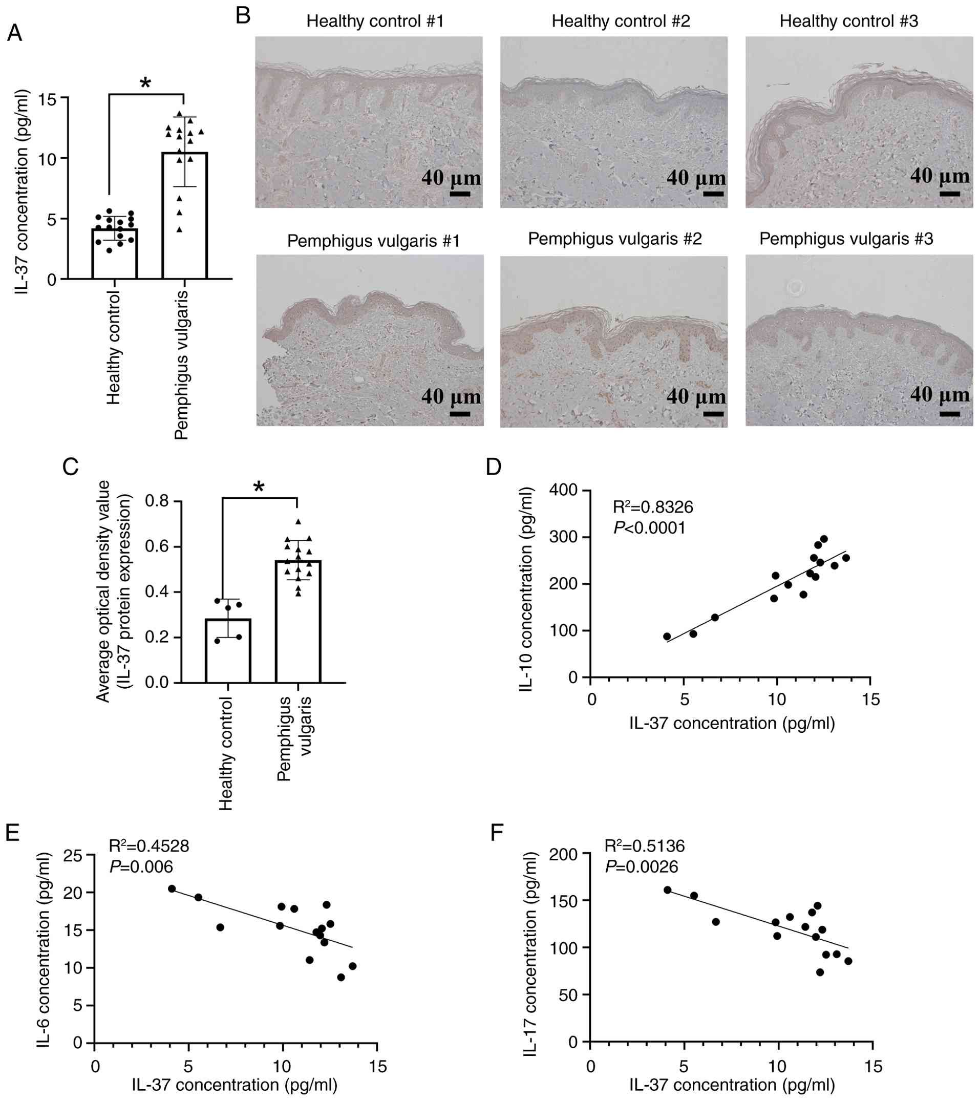 To elucidate the pathophysiological role of IL-37 in PV, the present study analyzed the concentration of IL-37 in the serum and skin tissues from healthy controls and. Serum IL-37 levels were markedly higher in patients with PV compared with healthy controls (Fig. 1A). Similarly, IL-37 expression was markedly elevated in the skin tissues of patients with PV than in healthy controls, as indicated by immunohistochemistry assays (Fig. 1B and C). Furthermore, serum IL-37 levels showed a positive correlation with the anti-inflammatory factor IL-10 (Fig. 1D), and a negative correlation with the pro-inflammatory cytokines IL-6 and IL-17 (Fig. 1E and F).