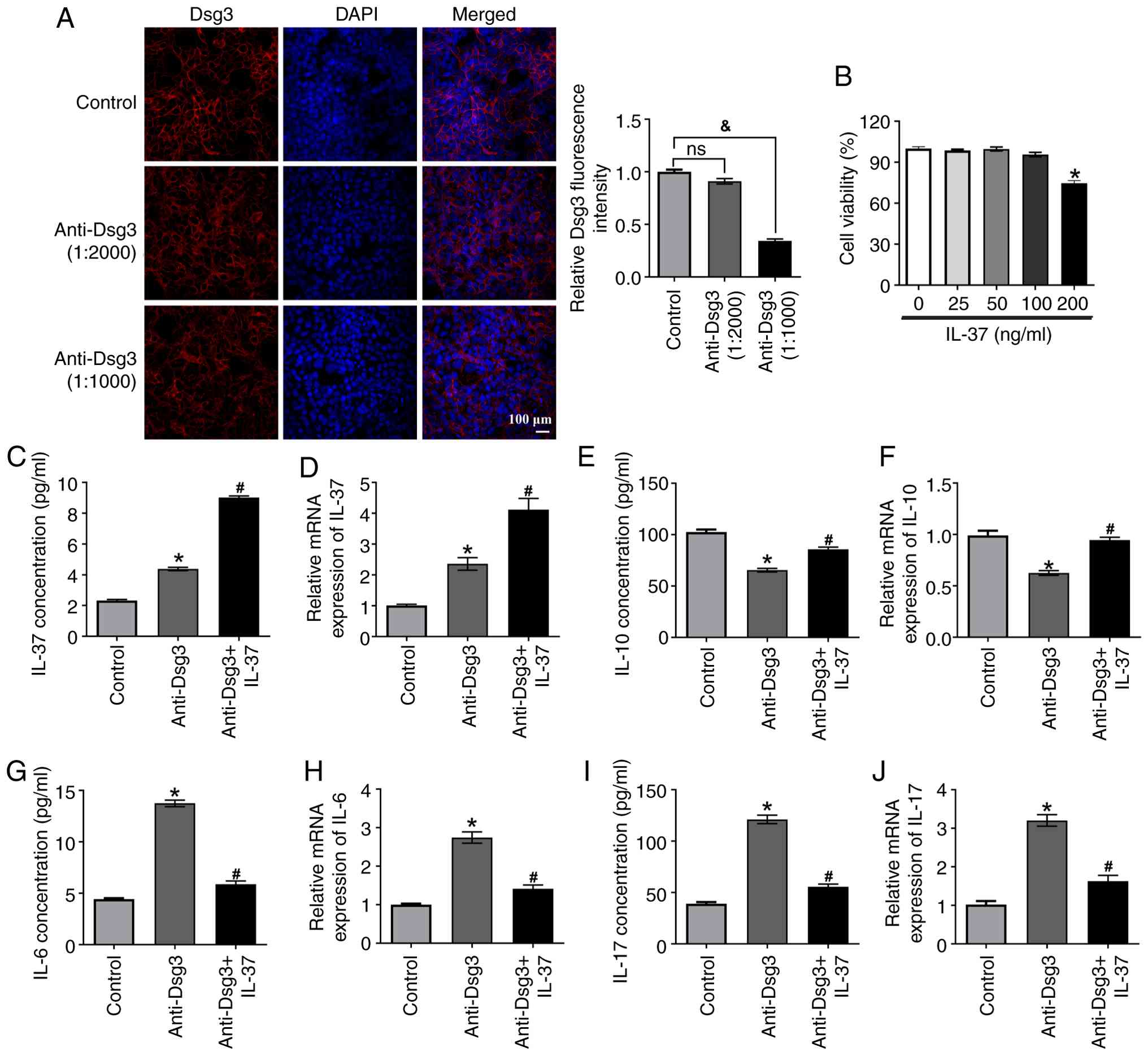 To investigate the functional role of IL-37 in PV, an in vitro PV model was established by treating HaCaT keratinocytes with the anti-Dsg3 antibody AK23. Immunofluorescence staining revealed that under control or with a low anti-Dsg3 antibody (1:2,000 dilution) treated conditions, Dsg3 exhibited a linear, continuous staining along the cell borders. By contrast, a higher anti-Dsg3 antibody concentration (1:1,000 dilution) resulted in markedly reduced Dsg3 staining, indicating impaired cell adhesion and successful modeling of PV-like acantholysis (Fig. 2A). HaCaT cells were treated with different concentration of IL-37 recombinant protein (0, 25, 50, 100 and 200 ng/ml). As shown in Fig. 2B, IL-37 at concentrations of 100 ng/ml and below had no effect on cell viability, whereas 200 ng/ml IL-37 markedly reduced cell viability. Therefore, 100 ng/ml IL-37 was selected for subsequent experiments. The anti-Dsg3 antibody treatment markedly increased the IL-37 levels (Fig. 2B and C). Co-treatment with 100 ng/ml of IL-37 and anti-Dsg3 antibody further enhanced IL-37 expression compared with anti-Dsg3 antibody alone (Fig. 2C and D). Additionally, the concentration and mRNA expression of IL-10 were markedly increased (Fig. 2E and F), while the concentration and mRNA expression of IL-6 (Fig. 2G and H) and IL-17 (Fig. 2I and J) were markedly decreased in IL-37 in combination with the anti-Dsg3 treated HaCaT group.