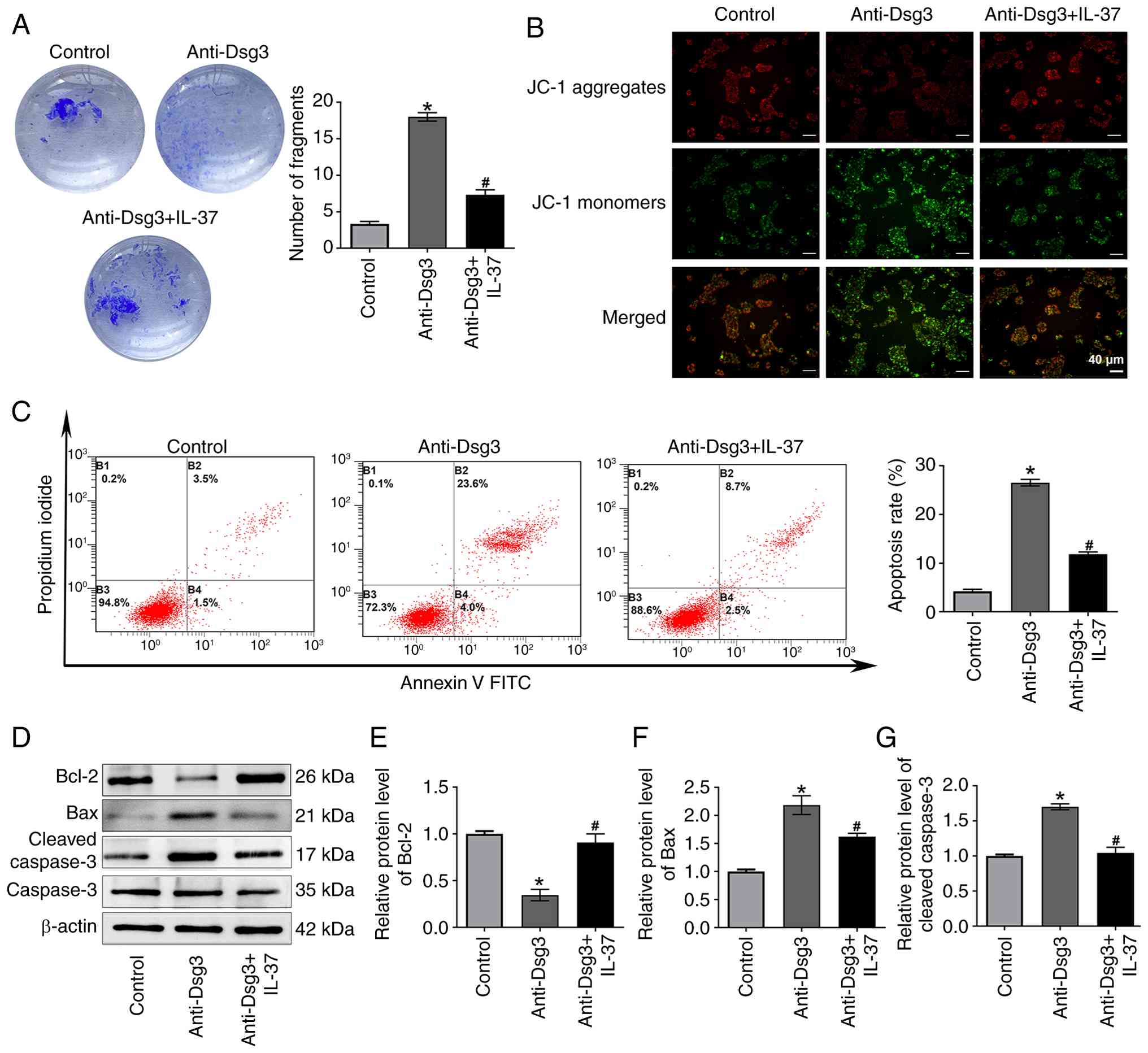 The dispase-based dissociation assays demonstrated a significant increase in the number of fragments in the anti-Dsg3 group compared with the control group (Fig. 3A). By contrast, IL-37 treatment reduced the number of fragments compared with the anti-Dsg3 group (Fig. 3A). Given that PV pathogenesis may be initiated by pro-apoptotic proteins and that the apoptotic pathway are activated prior to morphological signs of acantholysis (21,22), the present study further analyzed the apoptosis of the HaCaT cells. JC-1 assay revealed enhanced green fluorescence and reduced red fluorescence in the anti-Dsg3 group compared with the control group, indicating a transition from red to green fluorescence, characteristic of early apoptosis in the anti-Dsg3 group (Fig. 3B). However, IL-37 decreased the intensity of green fluorescence and increased the red fluorescence intensity, suggesting that IL-37 treatment increased mitochondrial membrane potential and inhibited cell apoptosis (Fig. 3B). Consistent with these findings, the flow cytometry analysis demonstrated that the apoptosis of HaCaT cells was increased in the anti-Dsg3 group compared with the control group, whereas the apoptosis of HaCaT cells in the anti-Dsg3+IL-37 group was decreased compared with that in the anti-Dsg3 group (Fig. 3C). Further analysis of apoptosis-related markers showed that anti-Dsg3 antibody exposure markedly decreased Bcl-2 expression and increased expression of Bax and cleaved-caspase 3 compared with the control group (Fig. 3D-G). IL-37 treatment reversed these changes, upregulating Bcl-2 and downregulating Bax and cleaved-caspase 3 expression (Fig. 3D-G).