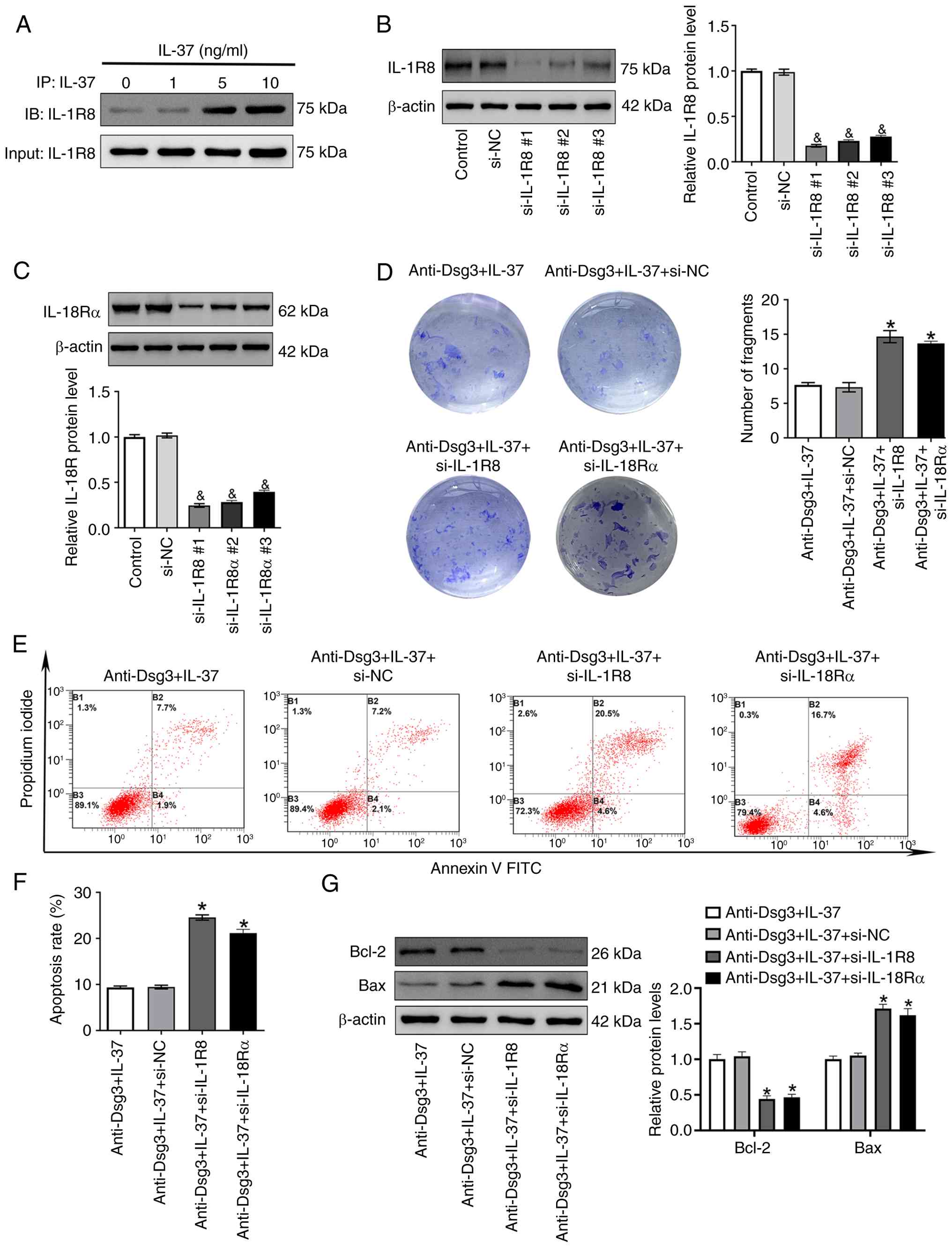 As a ligand protein, IL-37 functions by binding to its receptor IL-1R8 (23). The co-immunoprecipitation assay confirmed the interaction of IL-37 and IL-1R8 in the HaCaT cells (Fig. 4A). To further investigate the functional role of this interaction, IL-1R8 and IL-18Rα were knocked down in the HaCaT cells through transfection with IL-1R8-specific siRNA and IL-18Rα-specific siRNA, respectively. IL-1R8 and IL-18Rα expression were markedly decreased in IL-1R8 siRNA (Fig. 4B) or IL-18Rα siRNA (Fig. 4C) transfected HaCaT cells. Knockdown of either IL-1R8 or IL-18Rα resulted in an increased number of cellular fragments compared with the negative control siRNA transfected HaCaT cells (Fig. 4D). Additionally, the apoptosis rate was markedly higher in the anti-Dsg3 + IL-37 + si-IL-1R8 group and anti-Dsg3 + IL-37 + si-IL-18Rα group than in the anti-Dsg3 + IL-37 + si-NC group (Fig. 4E and F). Consistent with these findings, the Bax expression was upregulated, while the Bcl-2 expression was downregulated in the anti-Dsg3 + IL-37 + si-IL-1R8 group and anti-Dsg3 + IL-37 + si-IL-18Rα group relative to the anti-Dsg3 + IL-37 + si-NC group (Fig. 4G).