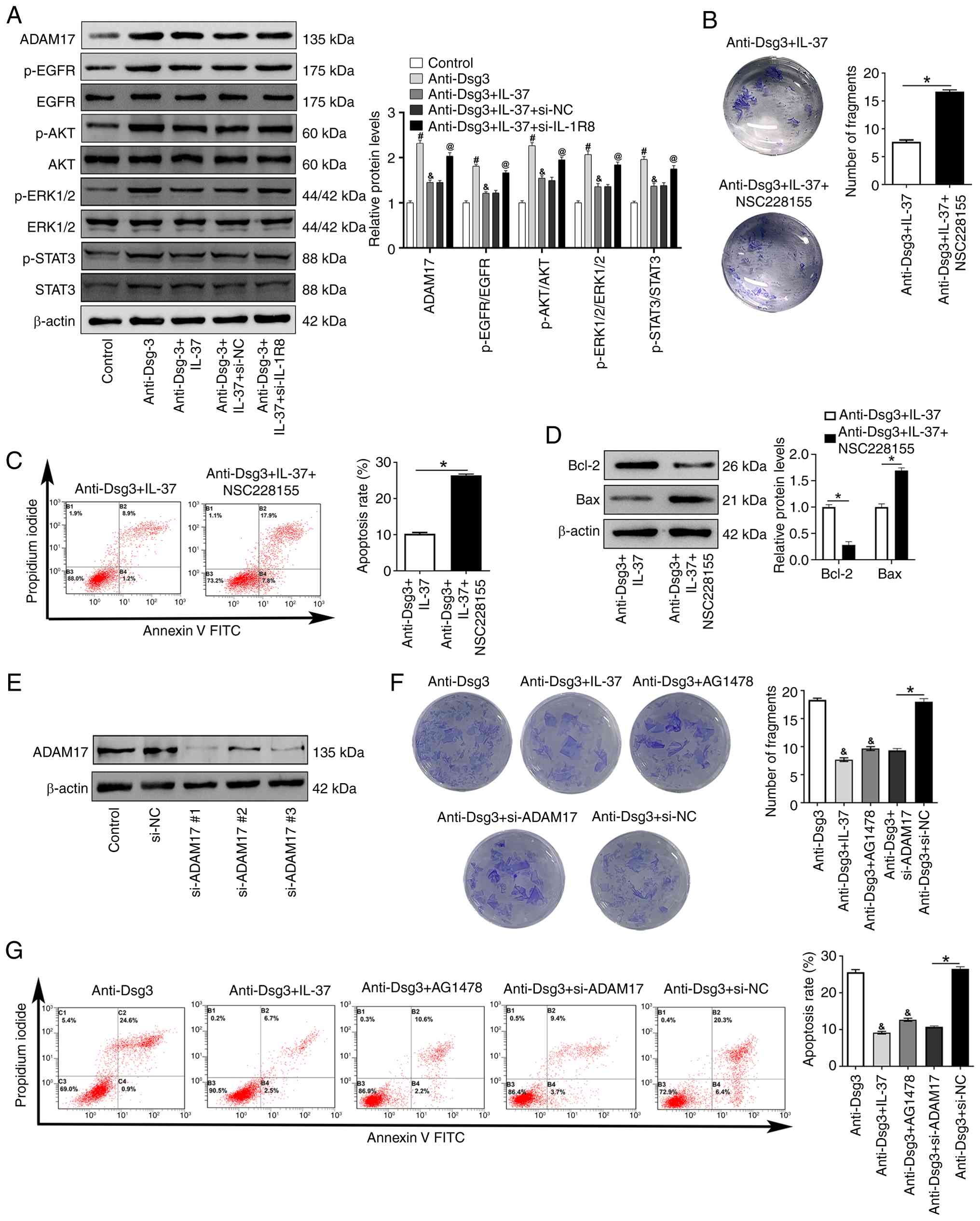 Subsequently, HaCaT was transfected with ADAM17 siRNA and western blotting showed a downregulation of ADAM17 after ADAM17 siRNA transfection, with ADAM17 siRNA #1 demonstrating the most pronounced reduction in protein level (Fig. 5E). This ADAM17 knockdown markedly decreased both epidermal fragment formation (Fig. 5F) and apoptosis rates (Fig. 5G) compared with anti-Dsg3+si-NC group. Notably, compared with the anti-Dsg3 group, EGFR inhibitor AG1478 also decreased epidermal fragment formation and apoptosis rates (Fig. 5F and G).