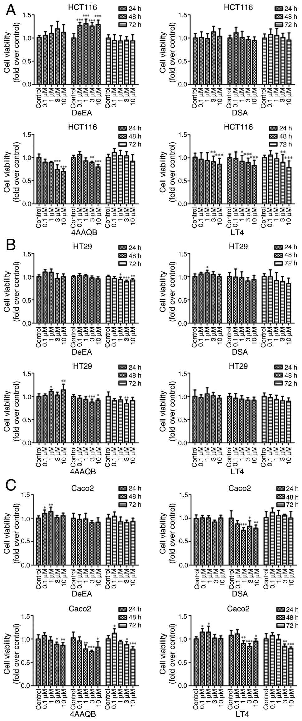 To evaluate the anticancer potential of four compounds derived from A. cinnamomea, including DeEA and DSA from the fruiting body and 4AAQB and LT4 from the mycelium, cell viability assays with three human CRC cell lines, HCT116 (KRAS mutant) and HT29 and Caco2 (both KRAS wild-type), were conducted. Cells were treated with increasing concentrations of each compound (0.1, 1, 3 and 10 μM) and cell viability was assessed at 24, 48 and 72 h using the CCK-8 assay (Fig. 1A-C).